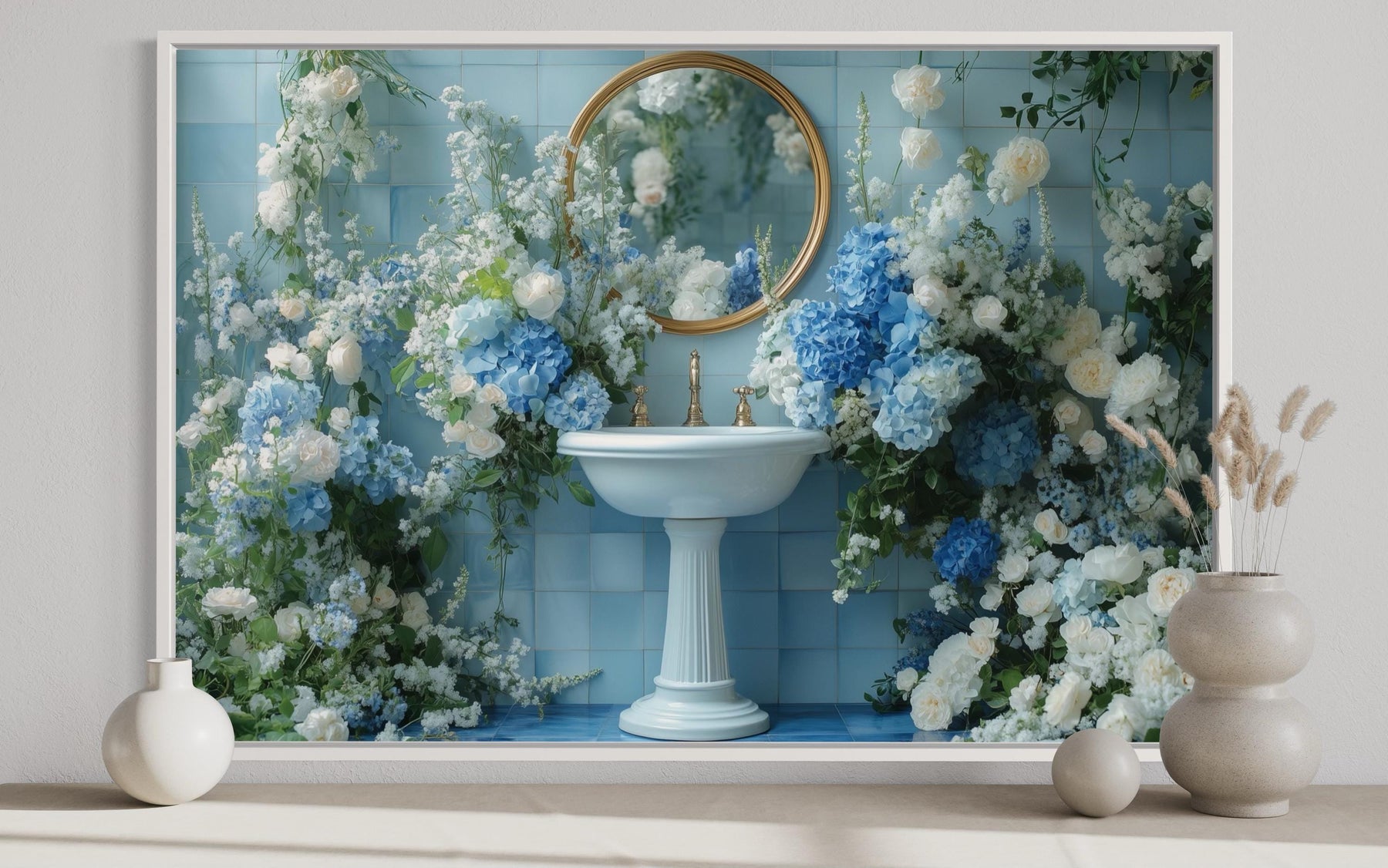The Blue Floral Sink Bathroom painting glows with a carefully chosen palette that evokes the cool stillness of dawn gardens and the gentle sparkle of clean water. Soft shades of sky and powder blue form the dominant petals, while deeper oceanic blues and subtle teals create layered shadows that enhance dimensional depth. Touches of fresh sage, muted mint, and gentle olive bring natural greenery to life, contrasting gracefully with the creamy whites of the sink and the background’s faint ivory undertones. Wisps of pearl gray and misty silver add quiet highlights, imitating the delicate reflection of morning light across porcelain and polished metal fixtures. Occasional hints of lavender and barely there violet lend a soft romantic glow, ensuring that each glance reveals new visual nuances. Whether illuminated by bright morning sunshine or warm evening lamps, these tones stay vivid yet soothing, providing a tranquil atmosphere all year long. The expert blending of cool and warm undertones means the Blue Floral Sink Bathroom canvas wall art pairs effortlessly with marble, tile, natural wood, or painted finishes in almost any palette. Designed to maintain its brilliance over time, this Blue Floral Sink Bathroom canvas print keeps its fresh, peaceful allure season after season, becoming a timeless centerpiece of elegant bathroom style.