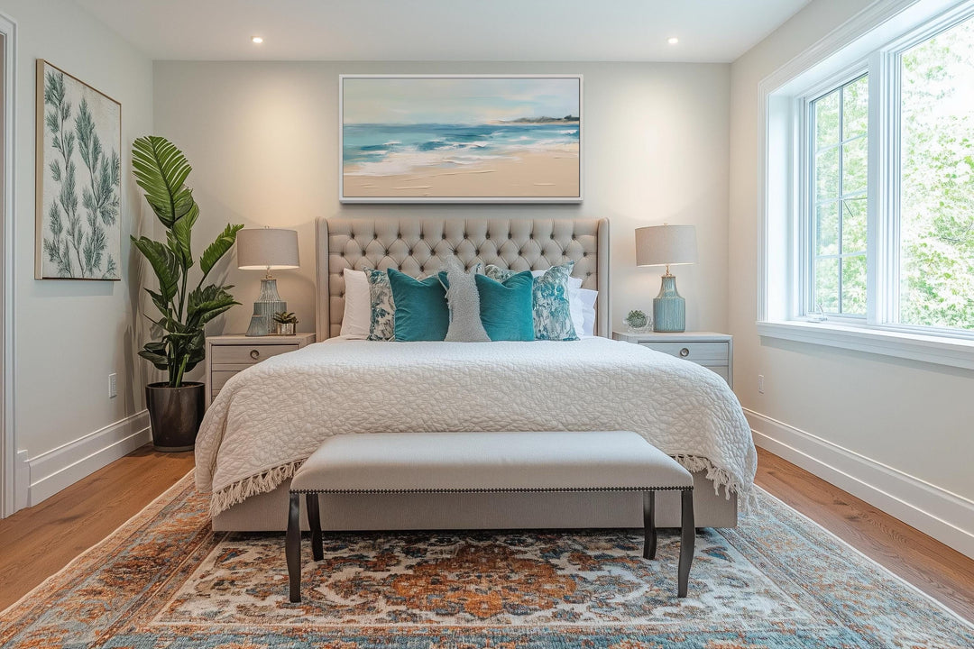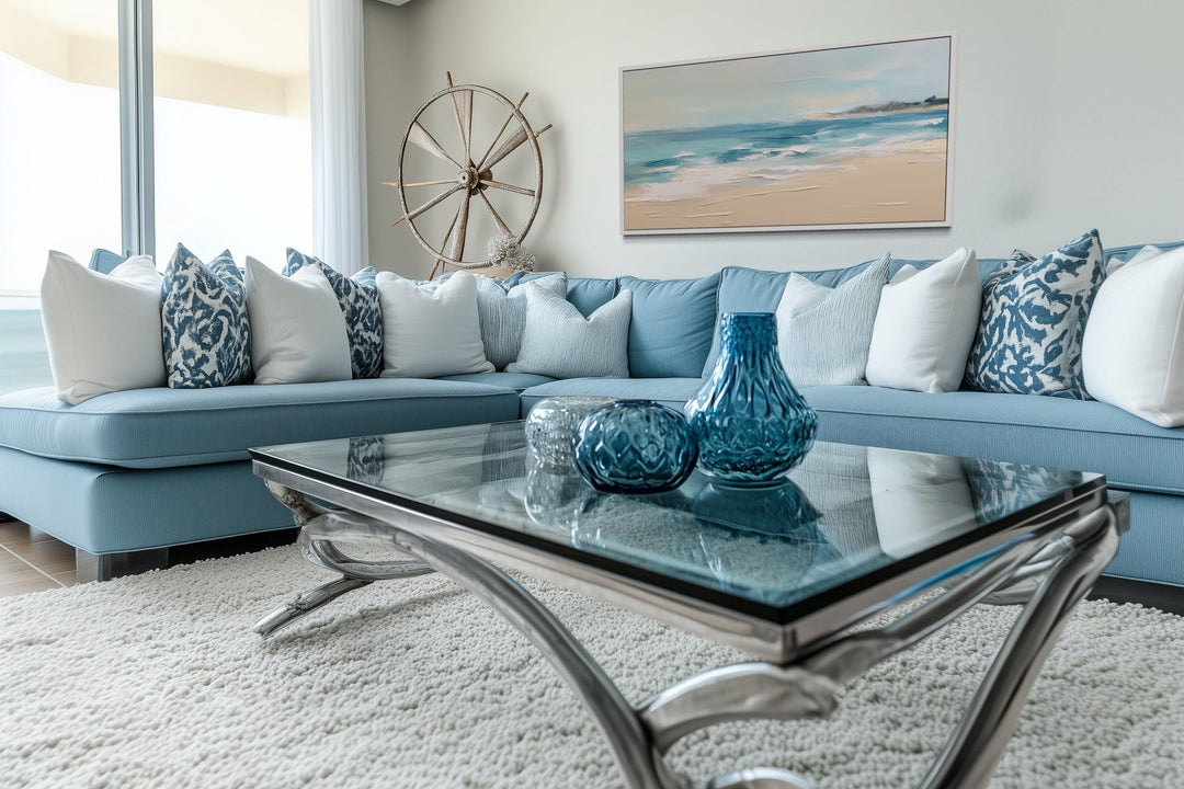 A soothing palette of soft blues, sandy beige, and crisp white defines this large coastal wall decor, creating a natural and airy aesthetic. The deep navy hues of the distant ocean blend seamlessly with the lighter turquoise and aquamarine tones of the gentle waves. Muted beige and pale taupe add warmth to the sandy shoreline, balancing the cool oceanic colors for a harmonious effect. The sky transitions through soft gradients of powder blue and ivory, enhancing the feeling of openness and calm. Subtle white highlights mimic the play of sunlight on the water, creating depth and movement within the painting. The neutral undertones ensure this artwork blends effortlessly with a variety of decor styles, from modern minimalism to classic coastal themes. Whether paired with natural wood, woven textures, or crisp white linens, the color scheme complements light, breezy interiors. This large coastal wall decor brings the soothing essence of the seaside into your home, making it a perfect choice for relaxation-inspired spaces.
