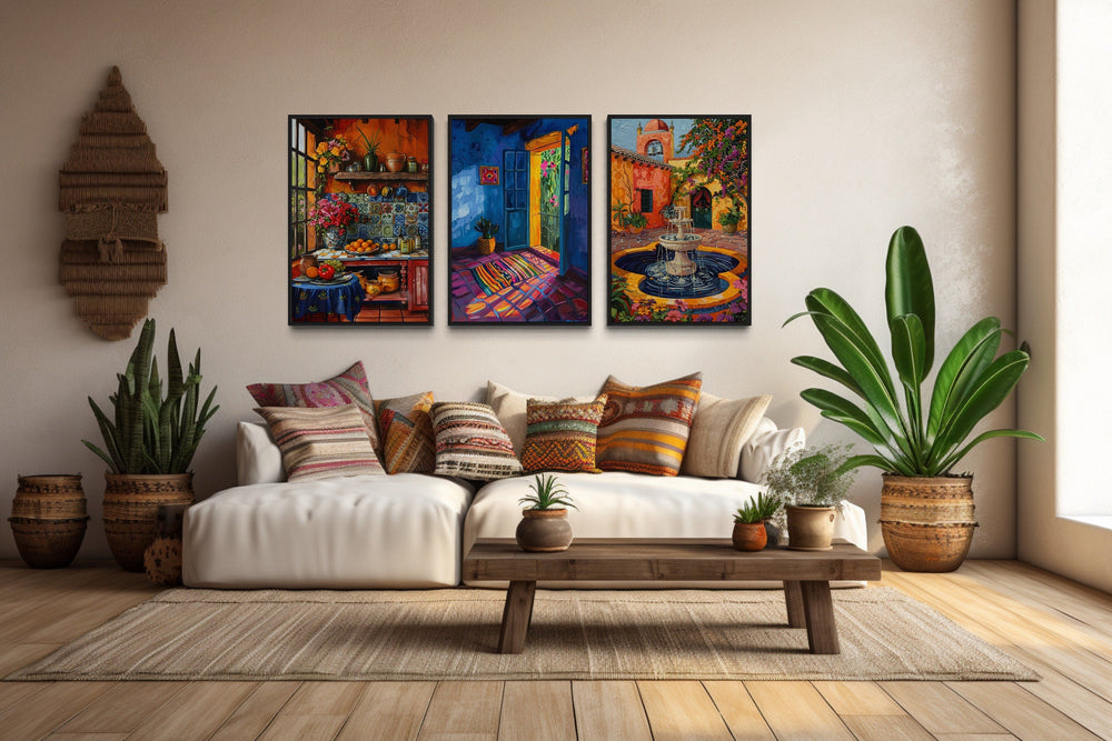 Our colorful Mexican kitchen wall art captures the vibrant essence of traditional Mexican life and design. This stunning framed canvas set depicts a lively kitchen brimming with bright ceramics, traditional cookware, and intricate decor, alongside a serene courtyard adorned with lush greenery and charming stone features. The artwork reflects the joyful and warm atmosphere of Mexican culture, emphasizing the rich patterns and textures unique to this style. Each piece offers a glimpse into the heart of Mexican homes, celebrating their vibrant artistry and inviting ambiance. The detailed brushstrokes bring the scenes to life, showcasing a perfect blend of color and culture. Whether you're drawn to the energetic kitchen or the tranquil courtyard, these pieces exude authenticity and charm. Framed and ready to hang, this set is an exceptional addition for anyone looking to infuse their space with warmth and tradition. Elevate your decor with this colorful Mexican kitchen wall art.