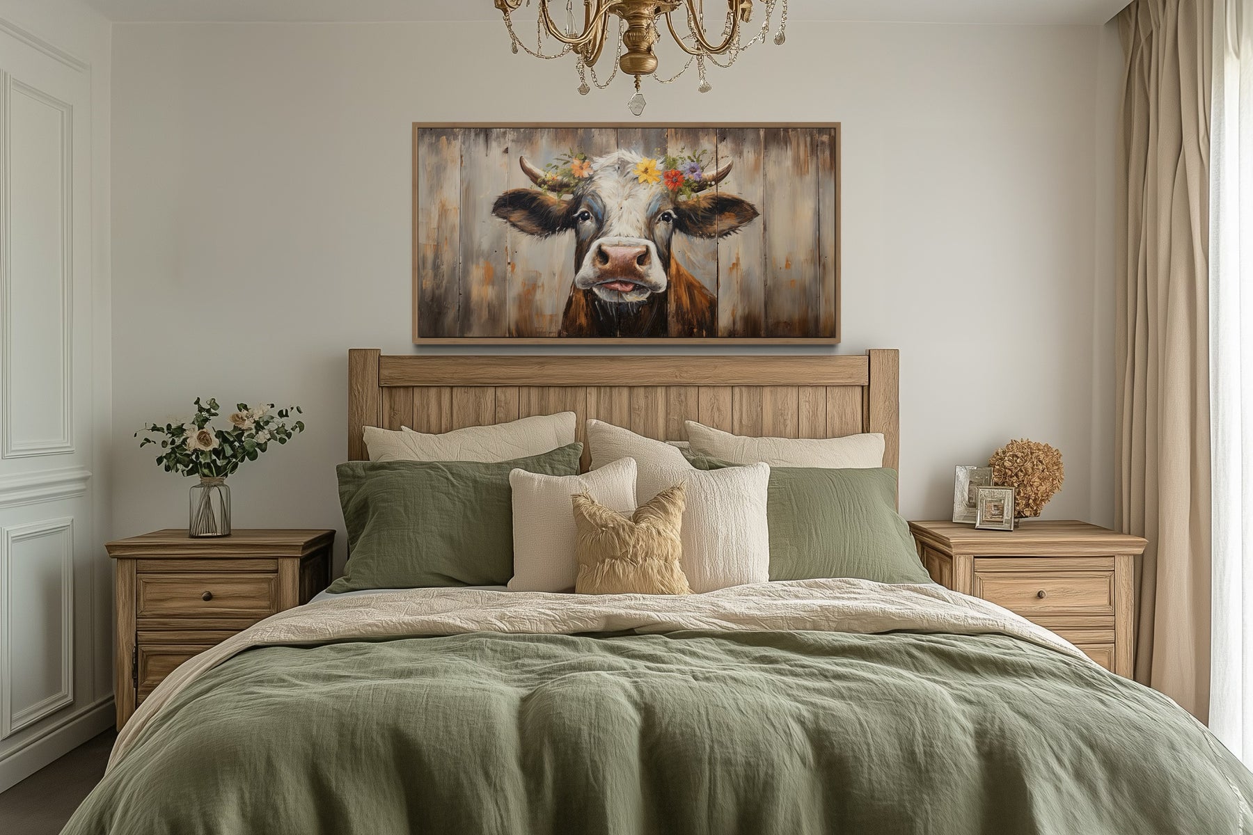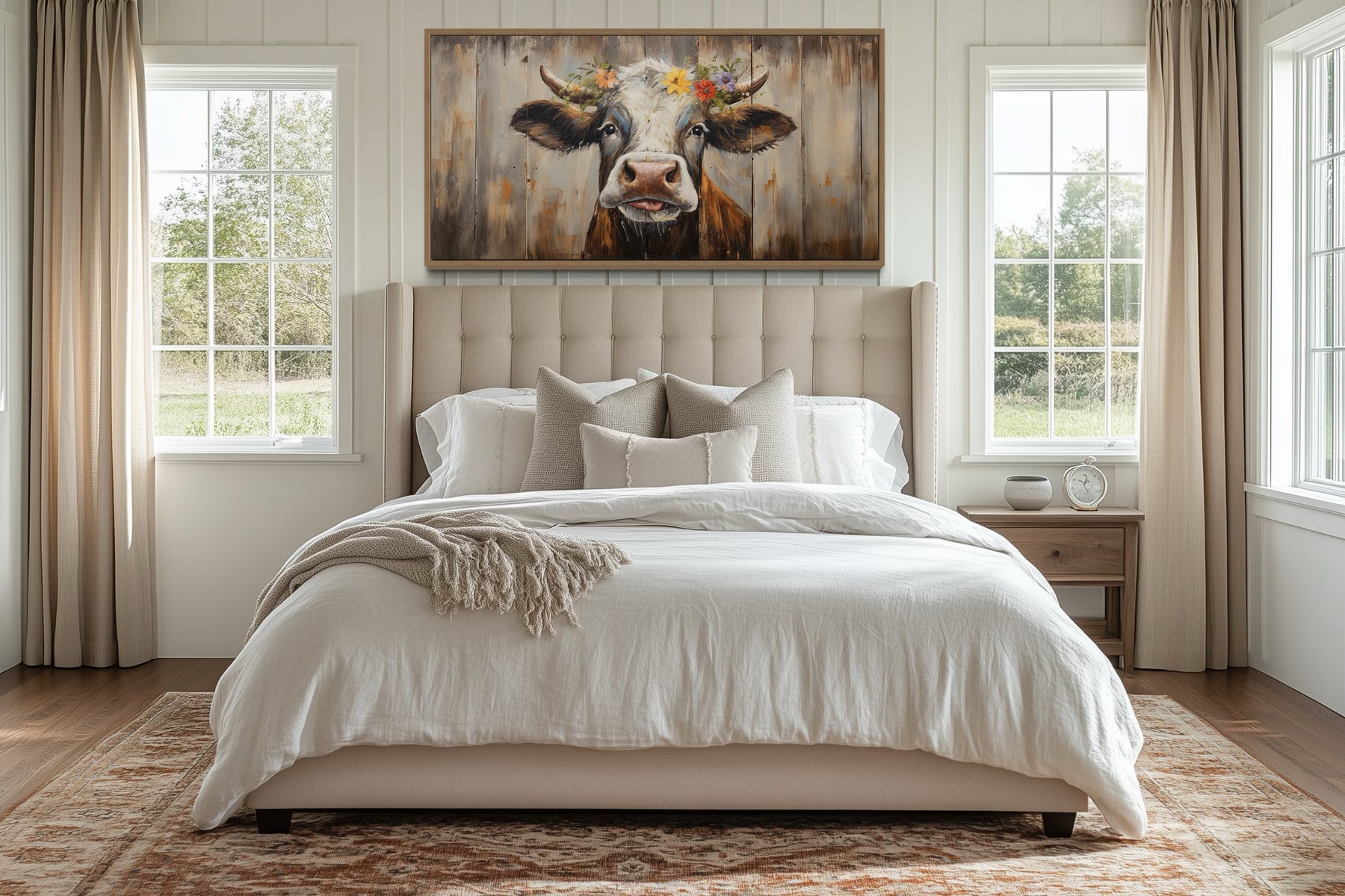 Bring a touch of rustic charm to your home with this adorable curious cow wall art. The detailed artwork of a farm cow, painted on a wooden canvas, captures the essence of farmhouse living. The rustic style of this piece adds warmth and character to any room, making it a perfect addition to your living room, kitchen, or even a cozy reading nook. The expressive eyes and charming floral crown of the curious cow create a delightful focal point that is sure to bring a smile to anyone's face. This wall decor is ideal for those who appreciate the beauty of farm life and want to bring a bit of that charm into their home. Its whimsical design is sure to become a favorite piece in your collection.