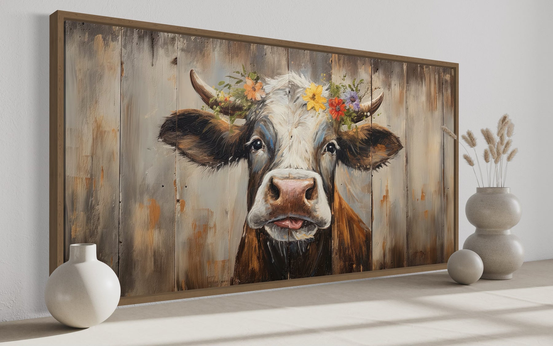 This charming curious cow wall art is perfect for enhancing the decor of any farmhouse-style home. Its rustic design and natural colors make it an ideal piece for living rooms, kitchens, or dining areas, where it can add a touch of country charm. The wooden canvas print is framed and ready to hang, making it easy to incorporate into your home decor. Whether you're decorating a cozy cabin or a modern farmhouse, this piece will fit right in, bringing warmth and personality to your space. It's also a great gift for anyone who loves farm animals or enjoys rustic decor. The curious cow design will undoubtedly become a talking point among guests.