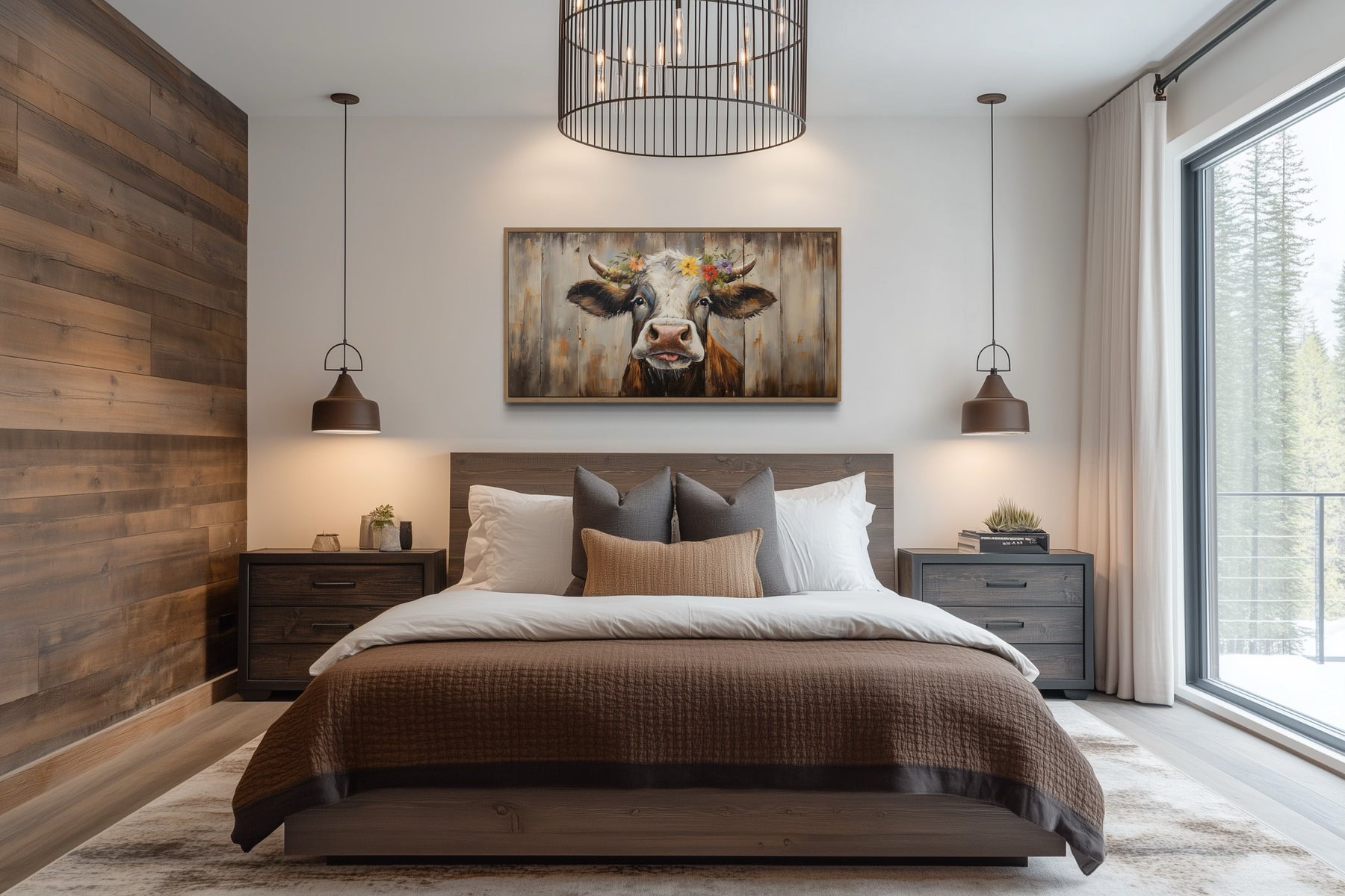 The color palette of this curious cow wall decor is warm and inviting, featuring earthy tones and soft neutrals. The cow's gentle brown and white fur contrasts beautifully with the weathered wood background, creating a harmonious blend that is both eye-catching and soothing. The subtle pops of color from the flowers in the cow's crown add a playful touch without overwhelming the overall aesthetic. This color scheme is versatile and can easily complement a variety of interior styles, from rustic farmhouse to modern country chic. It enhances the natural beauty of the piece, making it a standout addition to any room. The carefully chosen colors evoke a sense of tranquility and charm.