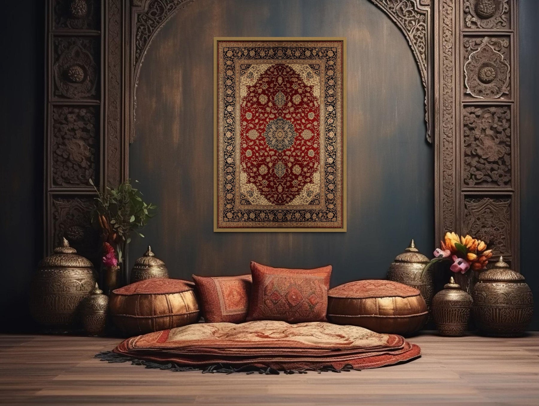 Our Framed Red and Gold Vertical Persian Rug canvas wall art captures the richness and intricate beauty of traditional Persian design in a stunning vertical composition. This luxurious canvas print features a finely detailed Persian rug pattern in deep red and radiant gold, displayed as a sophisticated framed artwork that evokes centuries of weaving artistry. The tall, elegant format draws the eye upward, emphasizing the ornamental borders and exquisite medallion at the center, while giving the impression of a genuine antique textile displayed with care. Intricate floral motifs and graceful arabesques reveal layer upon layer of delicate craftsmanship, each line and curve contributing to a sense of timeless refinement. The combination of vibrant red and glowing gold creates an atmosphere of warmth and opulence, adding character and depth to any wall. Soft highlights and precise shading enhance the fabric-like textures, so the rug seems to glow with its own inner light. Whether admired for its historic inspiration or its striking visual impact, this Persian rug canvas print brings a sense of cultural elegance and grandeur into any space. It is a celebration of artistry and tradition that rewards close viewing with endless visual discoveries. Our Framed Red and Gold Vertical Persian Rug canvas wall art is more than decoration—it is a testament to enduring beauty and heritage.