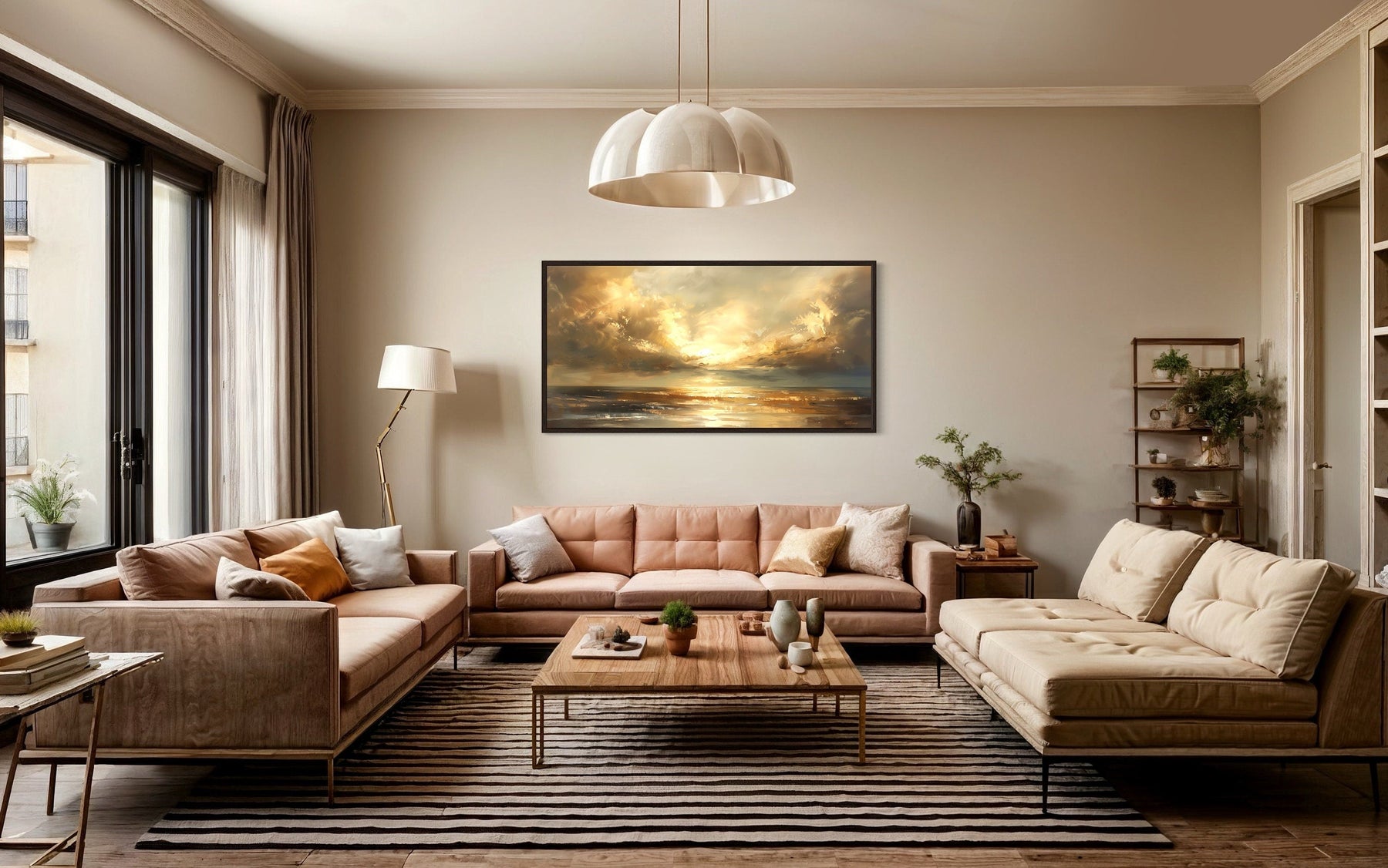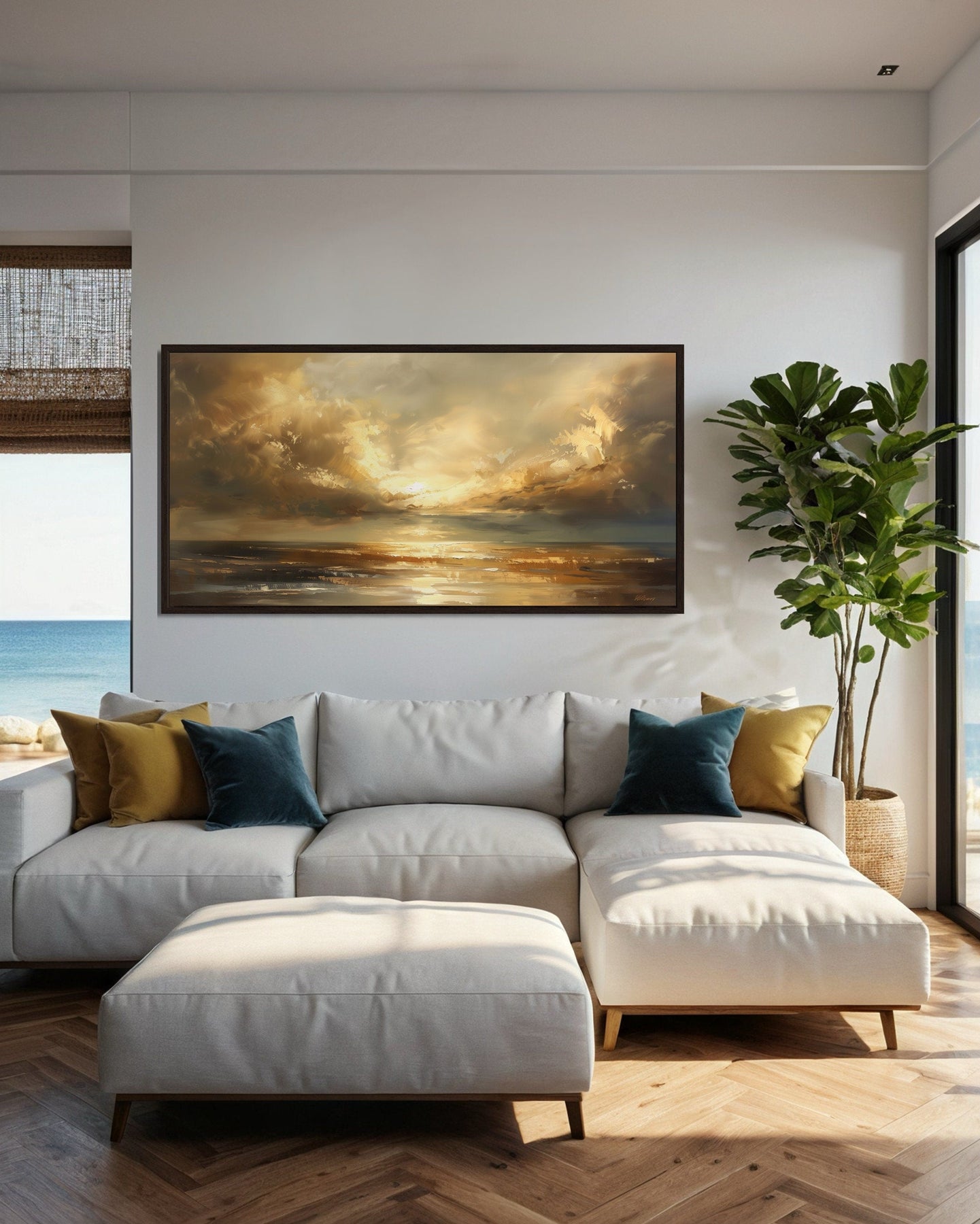 The color palette of this golden sunset over ocean artwork features a harmonious blend of warm and cool tones. Rich golds and soft oranges dominate the scene, reflecting the warmth of the setting sun. Gentle pinks and purples in the twilight sky transition seamlessly into the deeper blues of the ocean. This balance of vibrant and muted tones enhances the artwork's depth and realism. The interplay of light and shadow creates a glowing effect, adding dimension to the scene. These soothing colors make the piece ideal for creating a calm and inviting ambiance in your living room. Whether paired with light furnishings or natural textures, the artwork's colors effortlessly enhance its surroundings. Let the serene hues of this golden sunset over ocean wall art bring warmth and harmony to your space.