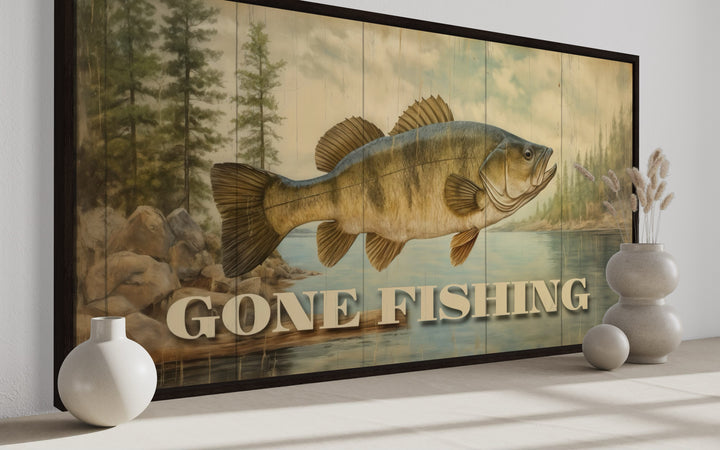 Gone Fishing Vintage Cabin Sign Framed Canvas Wall Art