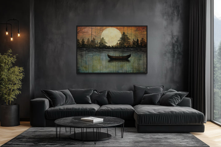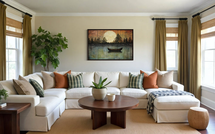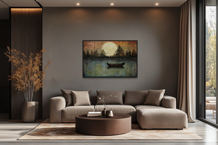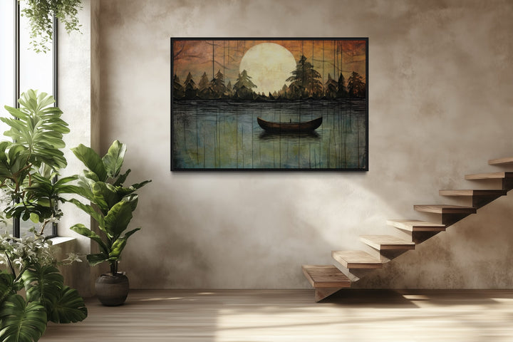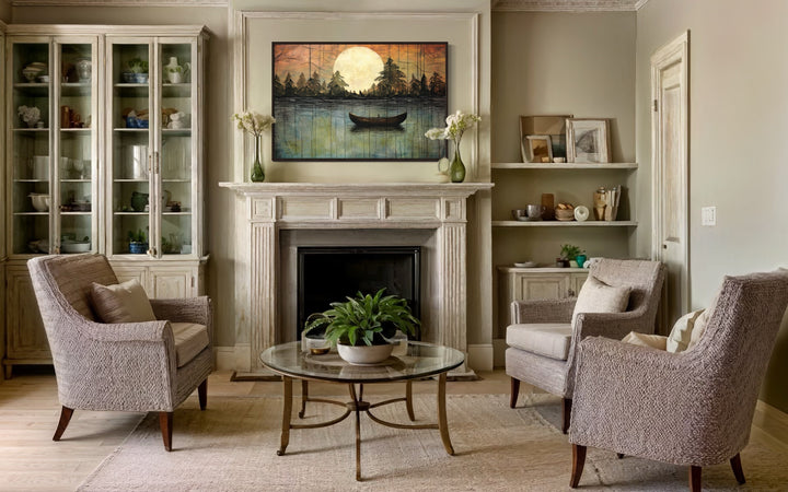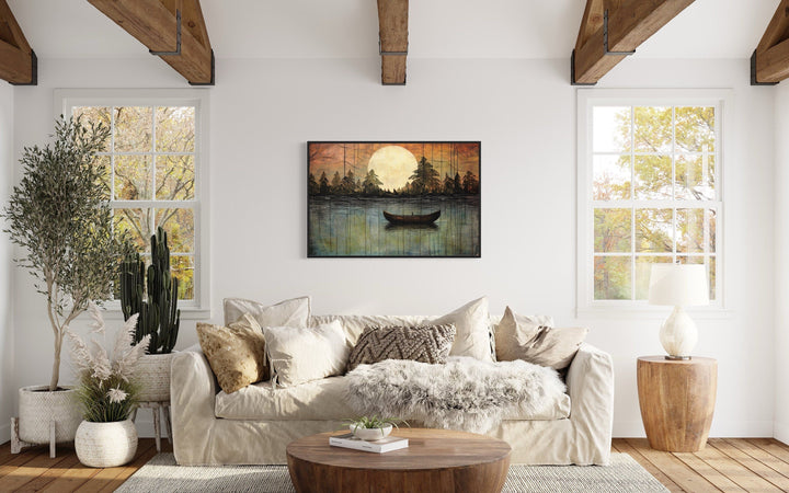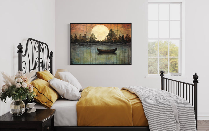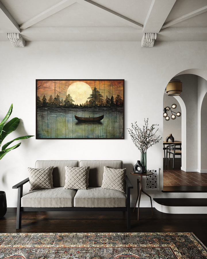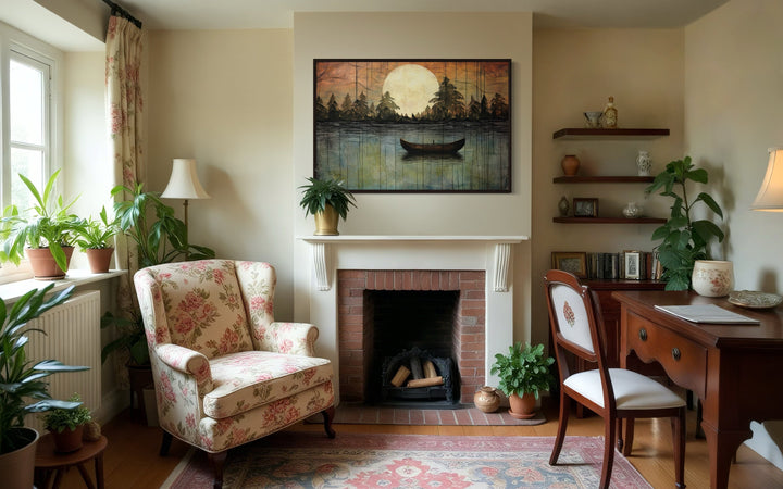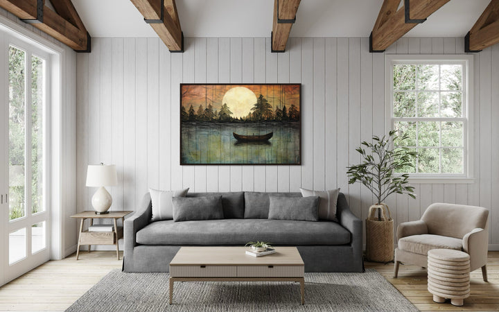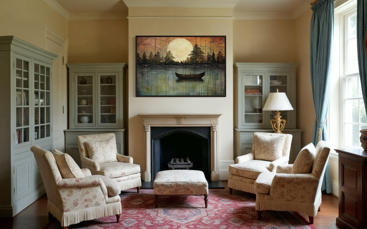 This lake moon boat painting is the perfect addition to homes that value rustic or cottage-style decor. Its nature-inspired imagery and soothing tones create a peaceful, inviting atmosphere, making it ideal for lakehouses, cabins, or cozy living spaces. For those looking to bring the outdoors inside, this artwork provides the perfect balance of serenity and warmth. The artwork fits beautifully in spaces designed for relaxation, such as bedrooms, reading nooks, or living rooms with wood or neutral accents. It also complements modern or minimalist homes that need a touch of nature to soften the space. Whether you hang it in a lakefront cabin or an urban retreat, this canvas print offers a timeless and elegant way to elevate your decor with a touch of the great outdoors.