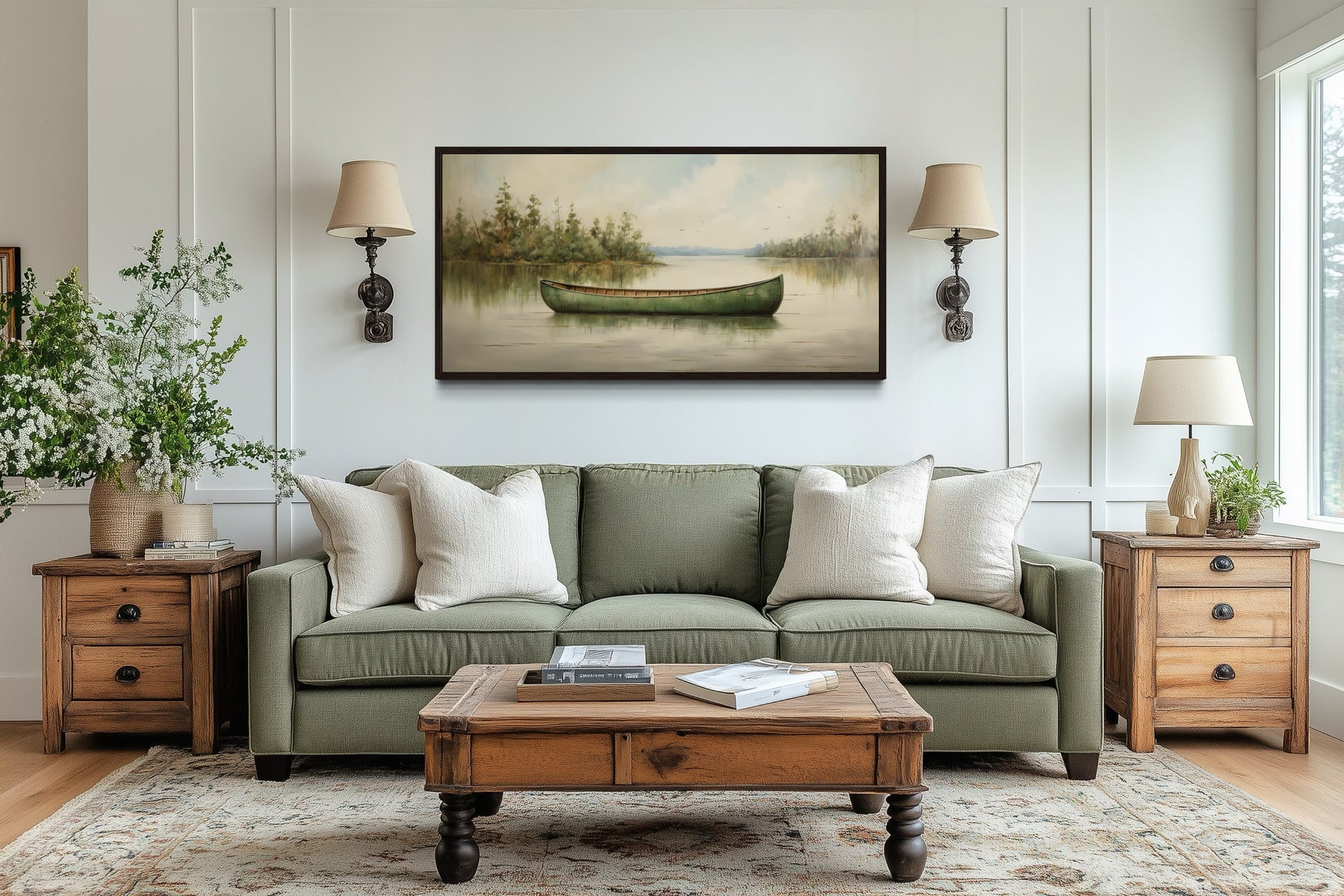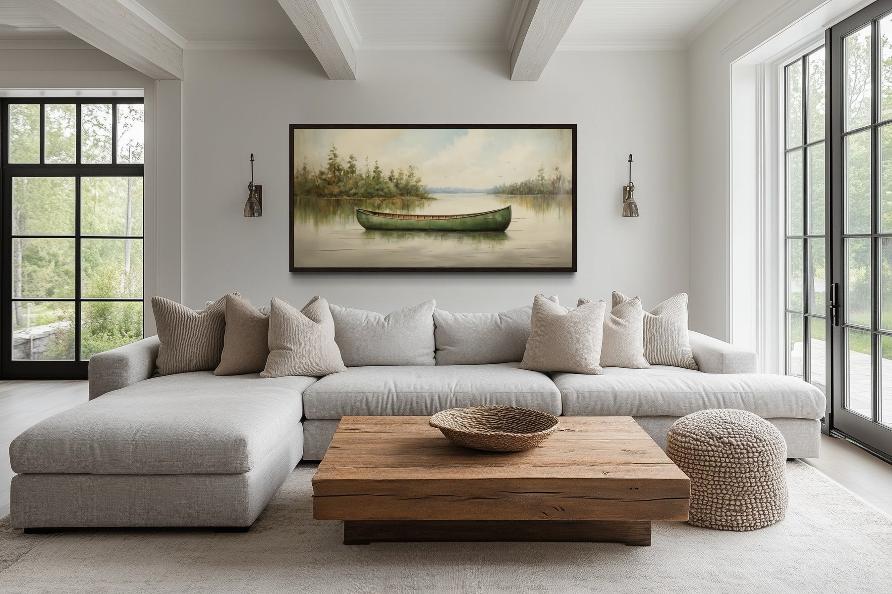 This green canoe wall decor is the perfect addition to cabins, lake houses, or spaces inspired by rustic and farmhouse aesthetics. Its timeless design and natural charm make it an excellent choice for rooms that celebrate the beauty of the outdoors. In a cabin, it complements wood-paneled walls and cozy furnishings, creating a cohesive, inviting atmosphere. For lakefront homes, it serves as a reminder of serene waterside moments, adding a personal touch to living areas or bedrooms. Its rustic appeal also suits farmhouse kitchens or dining rooms, where natural textures and earthy tones dominate. Styled above a mantel, sofa, or entryway console, this artwork becomes a focal point that ties the room together. Its tranquil scene resonates with those who love nature and seek to bring its peacefulness indoors. Enhance your rustic retreat with this captivating green canoe wall art.