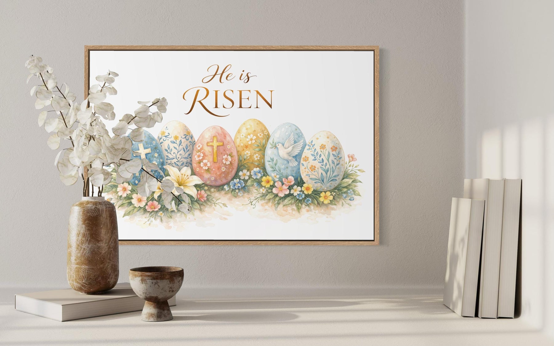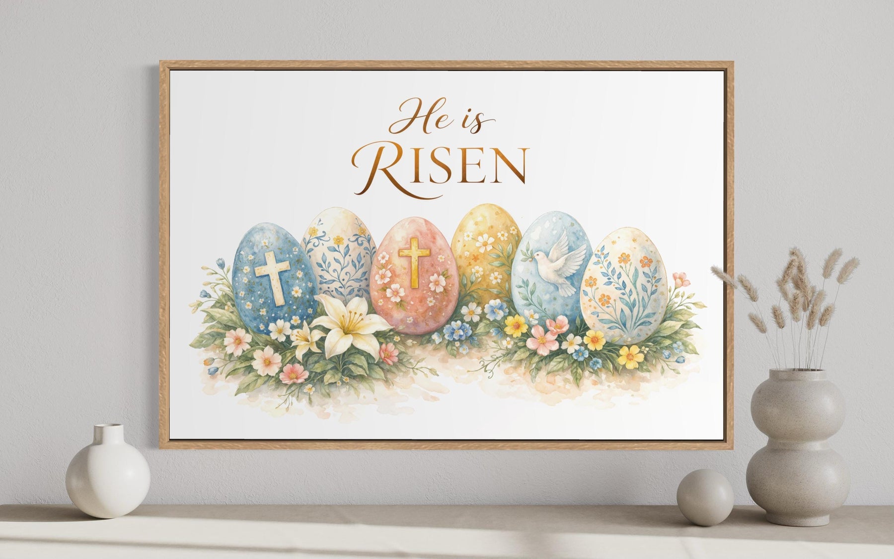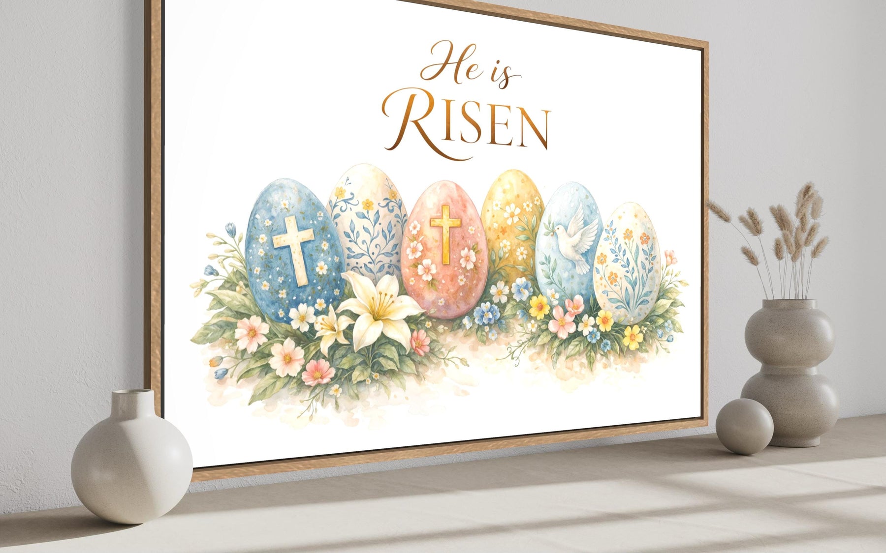 He Is Risen Wall Art – Christian Canvas Print with Cross and Floral Easter Decor