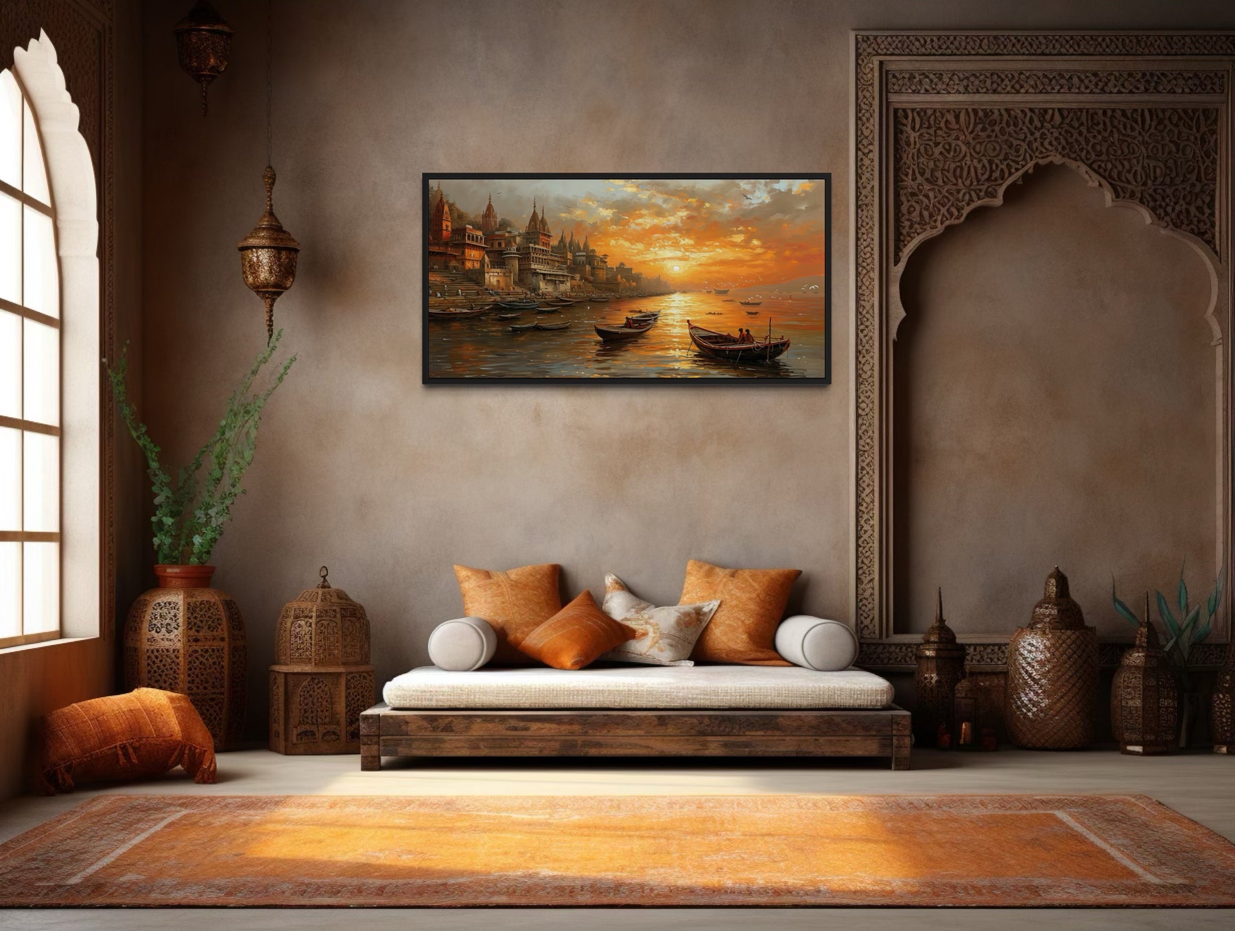This Varanasi-inspired wall art is perfect for interiors that embrace spirituality, culture, or a calming aesthetic. It shines in meditation rooms or prayer spaces, where its serene tones and reflective composition foster mindfulness and inner peace. In living rooms, the artwork serves as a striking focal point, drawing attention to its cultural richness and timeless beauty. Bedrooms can benefit from its soothing palette, creating a tranquil retreat that promotes relaxation. The painting also fits beautifully in entryways or hallways, offering a sophisticated and welcoming touch that speaks of history and tradition. Ideal for both traditional homes filled with ornate furniture and minimalist spaces craving warmth and depth, this canvas bridges the gap between heritage and modernity. Bring the charm and spirituality of Varanasi into your home with this Ganges River at sunset wall decor, celebrating India’s rich cultural tapestry.