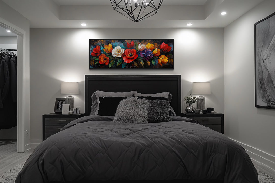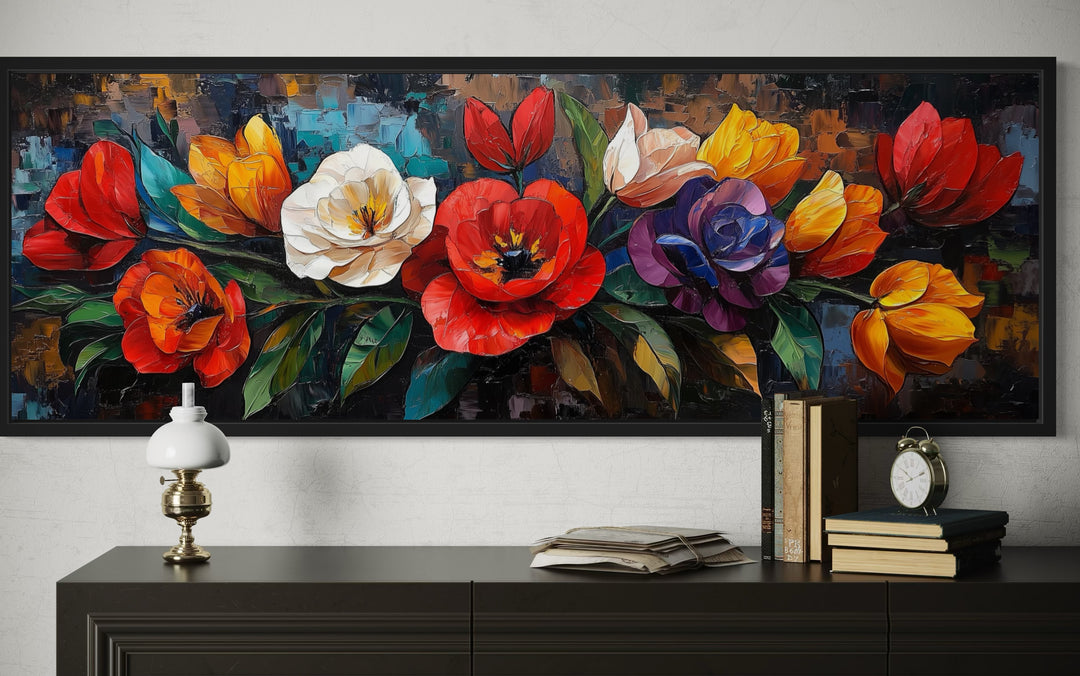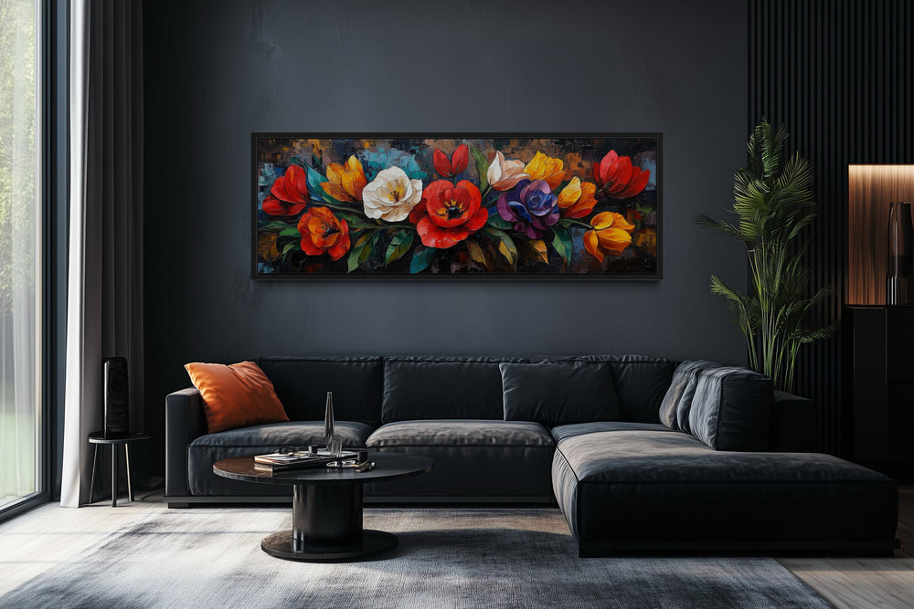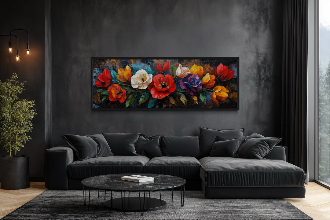 Transform your living room with the bold and elegant beauty of this large floral long horizontal wall art. Featuring a vibrant arrangement of colorful flowers, this framed canvas print is designed to captivate and enhance your interior space. The long horizontal format makes it an ideal centerpiece above a sofa or a focal point on a wide feature wall. Richly detailed, the floral design combines the beauty of nature with an artistic touch, creating a lively and dynamic visual impact. Perfect for living rooms that embrace both modern and traditional aesthetics, this artwork adds charm and sophistication to your decor. Its intricate patterns and striking colors make it a versatile addition that harmonizes with various furniture styles and settings. Whether you’re looking to refresh your space or complete your design vision, this floral canvas wall art delivers timeless appeal. Add a touch of nature’s beauty to your living room with this elegant framed piece.