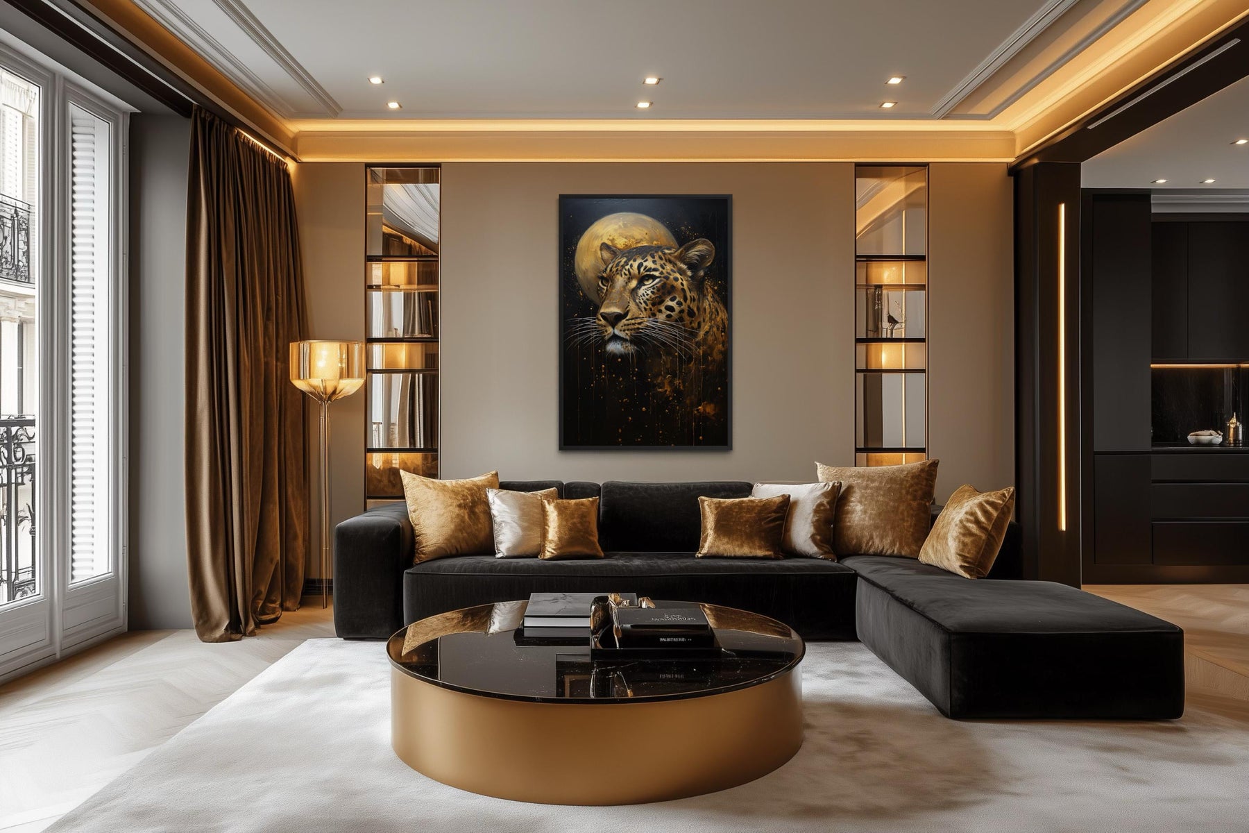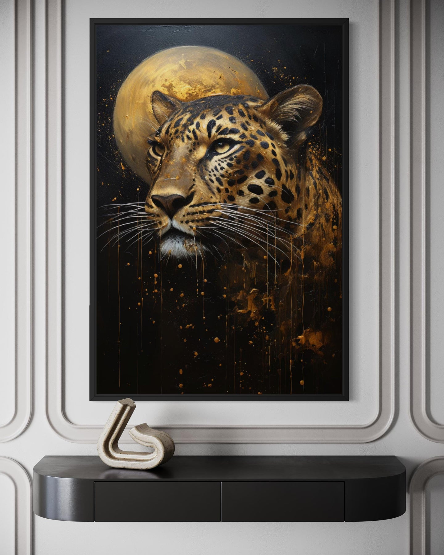 Our leopard and moon wall art presents a powerful wildlife scene captured as a high-quality canvas print. The artwork features a striking leopard portrait set against a deep, shadowed background. A glowing golden full moon rises behind the leopard, adding contrast and atmosphere to the composition. The leopard’s calm, focused expression gives the piece a strong and confident presence. Dark black tones mixed with warm gold highlights create a rich, cinematic look. The vertical format naturally draws attention and works well as a statement piece on its own. This artwork pairs beautifully with darker interiors, leather furniture, wood accents, and metal finishes. Subtle texture and lighting details add depth and realism to the canvas print. The color palette feels bold without being overpowering. It brings a sense of quiet strength rather than loud decoration. The artwork feels intentional, grounded, and refined. It fits spaces that are designed to feel personal and expressive. This leopard and moon wall art is especially suited for a man cave.