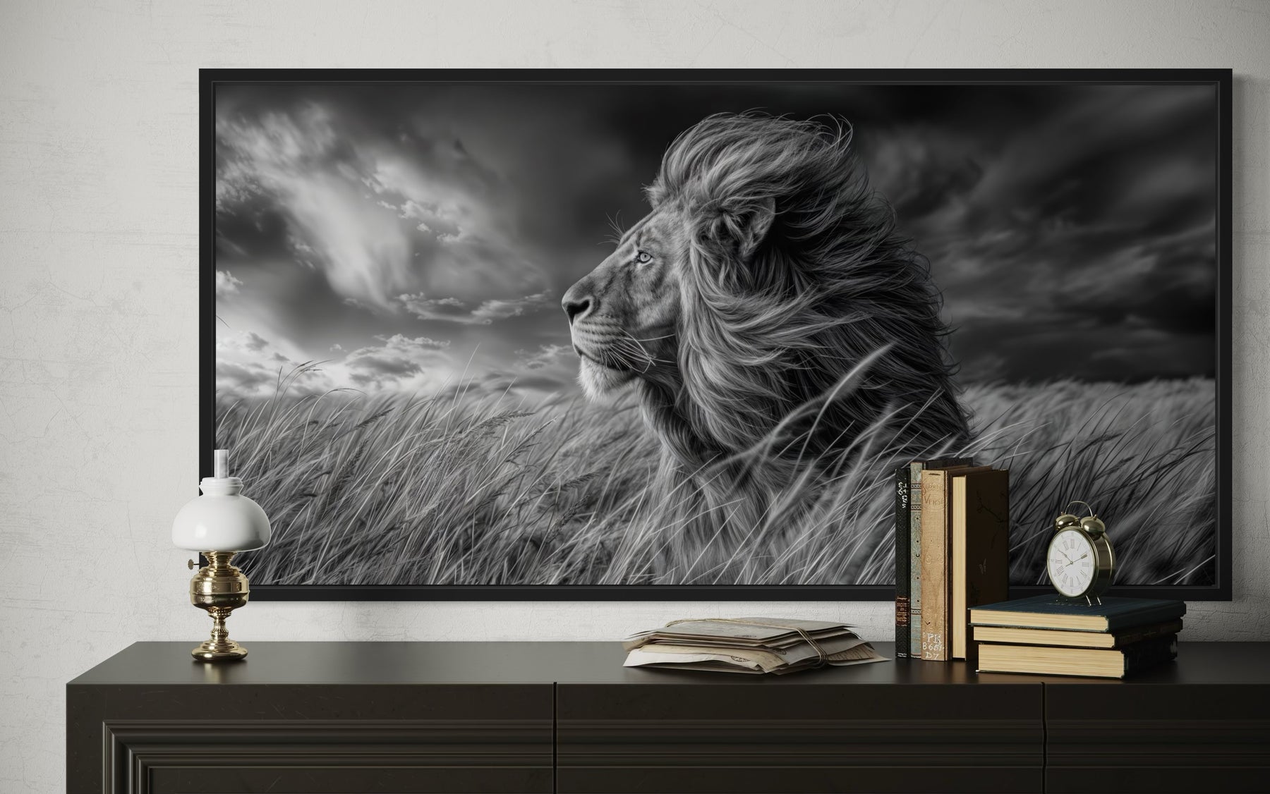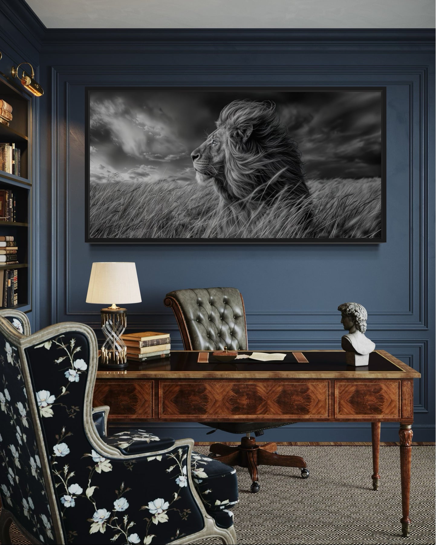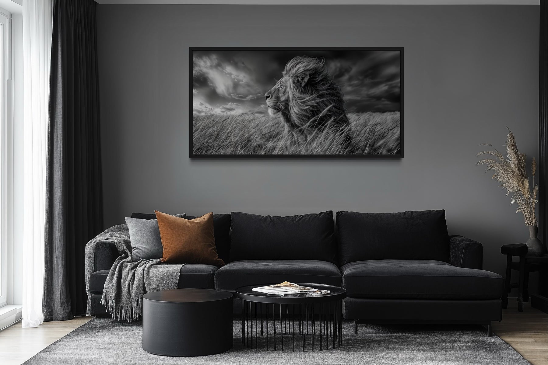 The color palette of this lion photography is a stunning monochromatic mix of black, white, and soft grays. The lion’s bold silhouette is set against the gentle gradients of the savanna grass, creating a captivating contrast. Subtle details in the background lend depth and texture, enhancing the artwork’s natural elegance. The interplay of light and shadow emphasizes the lion’s form, bringing a lifelike quality to the piece. These neutral tones make the artwork versatile, allowing it to complement modern, rustic, or traditional interiors. The monochrome design also adds a sense of sophistication, perfect for spaces that prioritize clean, minimalistic decor. This artwork’s palette evokes both tranquility and strength, making it an ideal addition to rooms seeking balance and harmony. Let this lion wall decor bring a touch of timeless beauty and refined grace to your home.