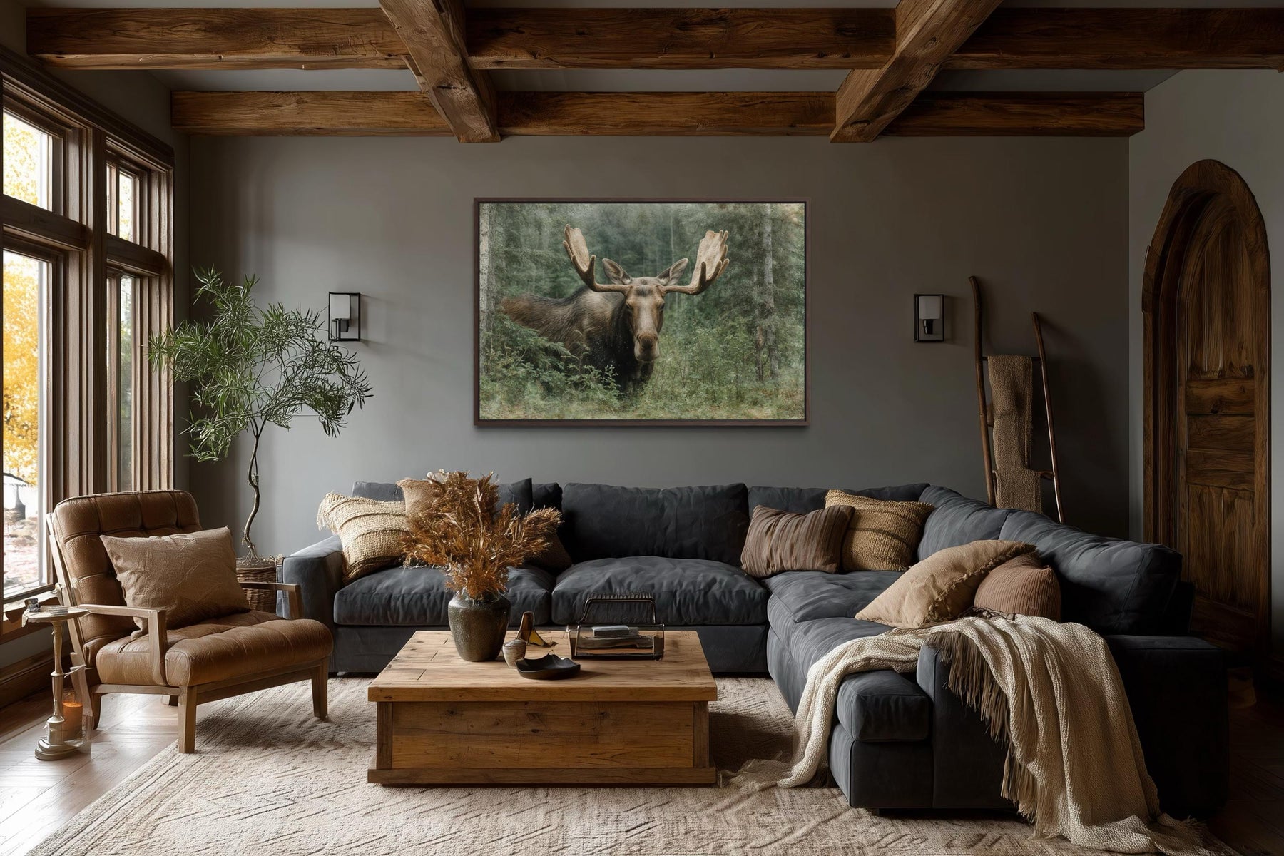 This Moose In The Forest wall art fits seamlessly into a cabin, lodge, or rustic living room where wood beams, leather seating, and woven textiles define the space. Hung above a sofa or fireplace, it becomes a central piece that establishes a woodland theme without needing additional decor. It pairs naturally with reclaimed wood furniture, iron accents, and neutral upholstery. In a reading room or quiet den it reinforces a relaxed atmosphere connected to nature. The horizontal layout works especially well on long walls that benefit from a single expansive image. Rooms with stone, warm lighting, and layered fabrics gain depth from the landscape setting. The subject brings a sense of the outdoors inside while maintaining a refined, painterly style. In modern rustic interiors it acts as a natural focal point that softens clean lines. The scale allows it to balance large furniture without feeling crowded. Our Moose In The Forest canvas wall art completes interiors that revolve around warmth, texture, and a connection to wilderness.