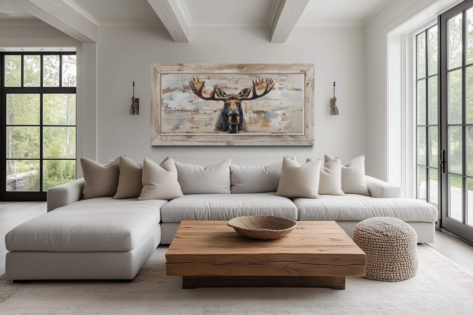Our moose painting on wood canvas wall art brings the essence of the wilderness into your space with rustic charm and refined craftsmanship. The artwork features a striking moose, realistically detailed and set against a backdrop that mimics aged, weathered wood. The textured look gives the impression of a hand-carved surface, blending contemporary artistry with a rugged, cabin-inspired aesthetic. The moose, standing tall and serene, captures the beauty of nature and wildlife, making it an eye-catching centerpiece. Perfect for those who admire the outdoors and rustic design, this canvas exudes warmth and authenticity. The extra-large size ensures it commands attention while maintaining a harmonious balance in your decor. With its lifelike detailing and wood-like texture, this piece adds a timeless appeal to any room. This moose canvas wall art is the ideal combination of rustic elegance and wildlife beauty.