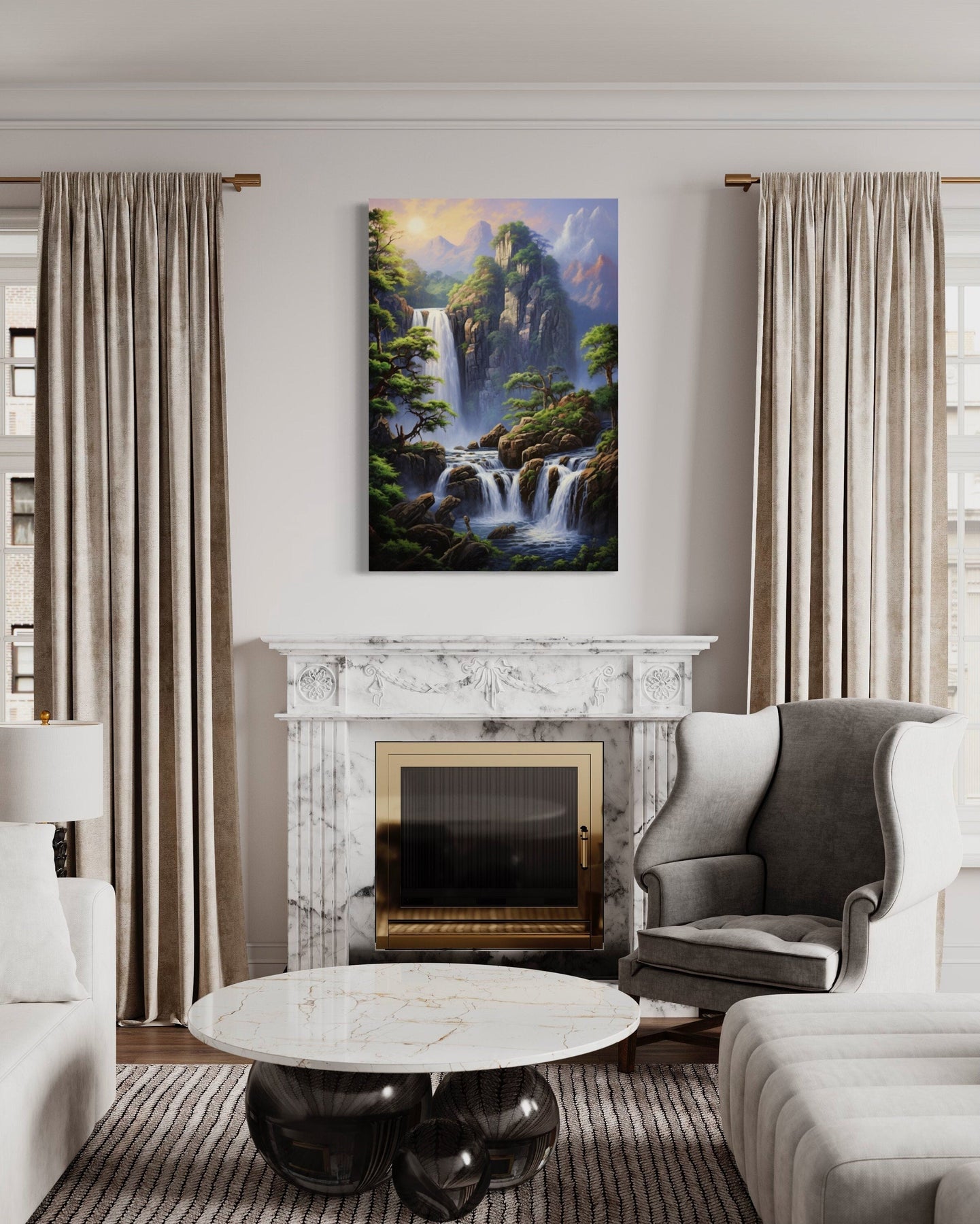 This waterfall wall art beautifully captures the serene majesty of a cascading waterfall nestled within a lush mountain forest. The vertical composition of the painting accentuates the height and grandeur of the waterfall as it tumbles down over moss-covered rocks, surrounded by vibrant green foliage. The flowing water is depicted with intricate detail, creating a sense of movement and tranquility that draws the viewer into the scene. This mountain forest landscape painting is perfect for those who find peace and inspiration in nature's wonders. Whether you’re looking to bring a touch of the outdoors into your home or create a calming atmosphere in your living space, this canvas print is an ideal choice. The artwork is available in both framed and unframed options, ready to hang and transform your room with its natural beauty.