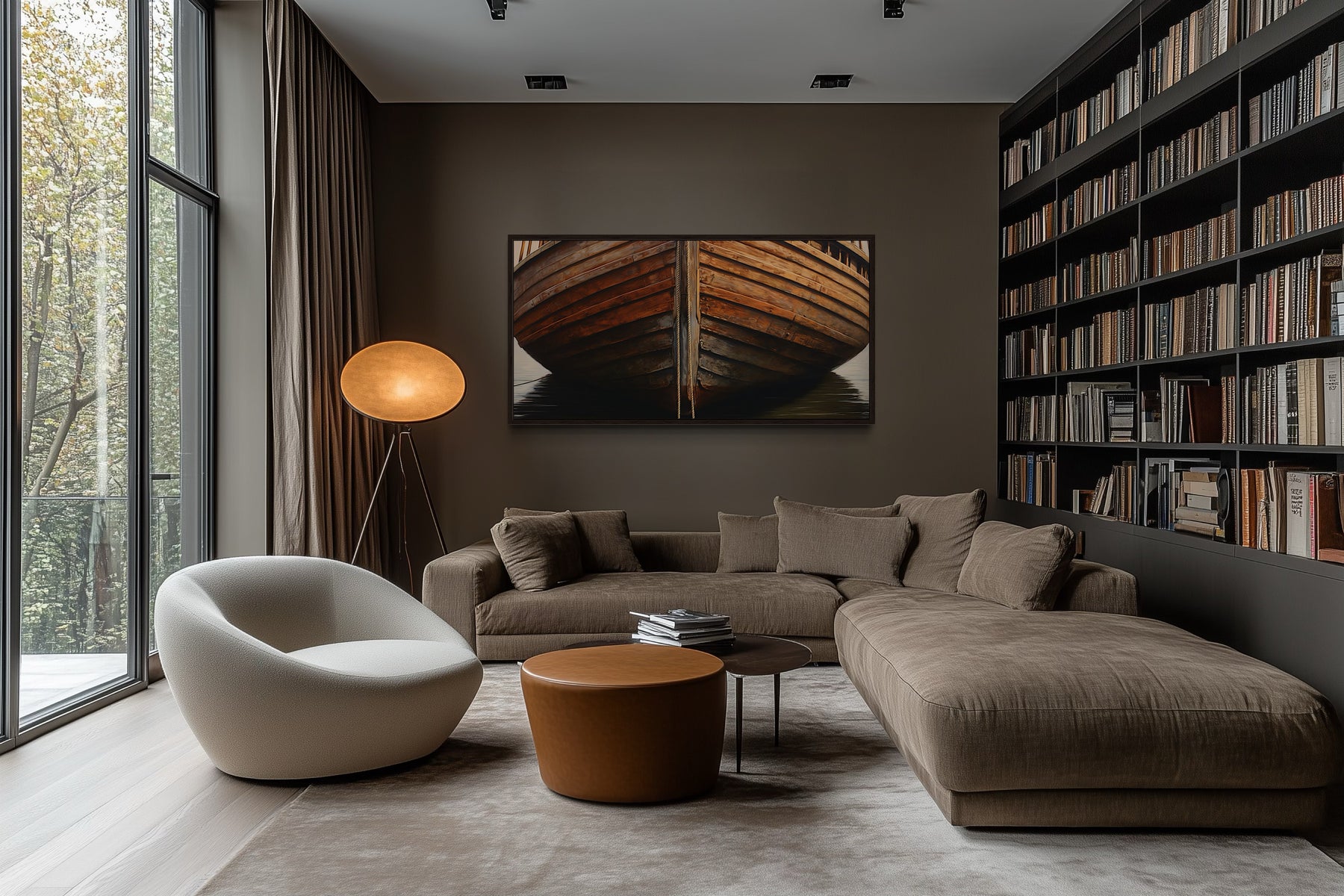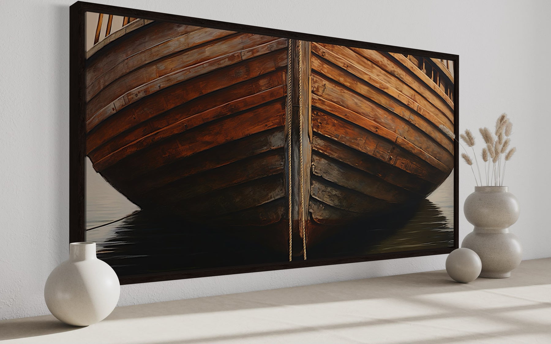 The color palette of this old brown boat painting is dominated by deep, earthy browns and warm, muted tones that highlight the natural beauty of the wood. The rich, dark hues of the boat’s weathered planks are complemented by the subtle variations in color that suggest age and wear, adding to the artwork’s rustic appeal. The background features soft, neutral shades that provide a calming contrast, allowing the boat to stand out as the central focus of the piece. The use of warm, inviting colors creates a cozy atmosphere, making this canvas print perfect for spaces where relaxation and comfort are key. The overall color scheme is both timeless and versatile, ensuring that this artwork will enhance a variety of decor styles while maintaining its rustic charm.