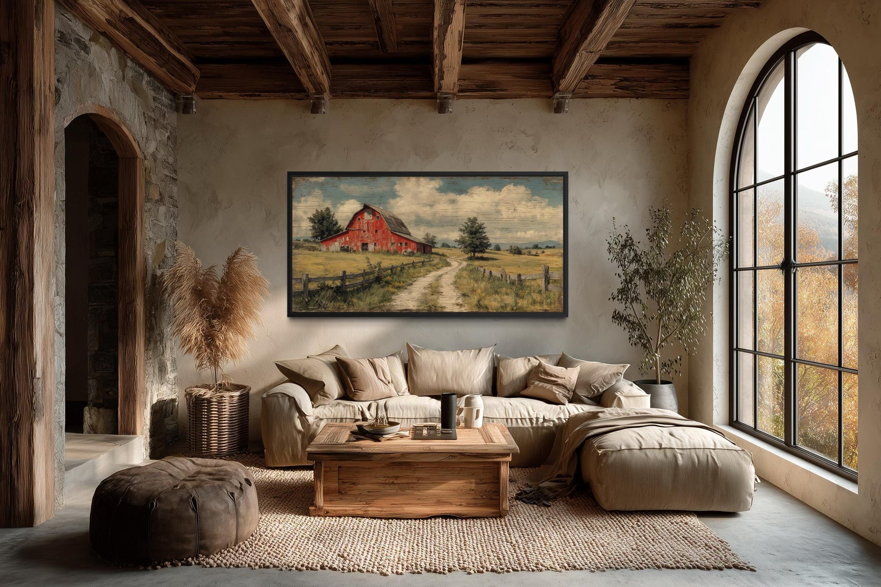 This piece was made for the farmhouse living room — specifically the large, open-plan farmhouse living room where a wide horizontal canvas has the space and the wall to become the defining visual statement of the entire room. A farmhouse living room done right is not just comfortable — it is grounded, warm, and rich with a sense of place and heritage that mass-market decor simply cannot manufacture, and a large-scale red barn landscape painting is one of the most effective single tools available for creating that atmosphere instantly. Hung above a shiplap fireplace surround, centered over a linen sofa, or displayed on a wide whitewashed accent wall, this red barn wall decor transforms the room's entire visual story from pleasant to genuinely memorable. The large horizontal format fills wall space with confidence — no awkward gaps, no need for gallery wall arrangements, just one powerful image doing the work of many. A farmhouse living room furnished with distressed leather, aged wood coffee tables, woven textiles, and vintage ceramic accessories will find in this piece the exact visual anchor it has been missing — something that ties every rustic, natural element together with a single clear and beautiful image. The country home and the ranch-style house are equally natural homes for this landscape — anywhere that the open land, changing seasons, and the rhythms of rural life are part of the daily visual vocabulary, this painting belongs. The classic American subject matter makes it particularly meaningful in homes where the rural heritage of the family is something to be honored and displayed rather than minimized or hidden. It is large enough to be the first thing guests see when they walk through the door and specific enough in its subject to spark a real conversation every single time. The horizontal format also makes it a natural fit for dining rooms with wide feature walls, where it creates an almost panoramic countryside view that makes every meal feel a little more expansive. Hang it with pride in your farmhouse living room and let this red barn canvas print do what great landscape art has always done — make the room feel like it belongs somewhere beautiful.