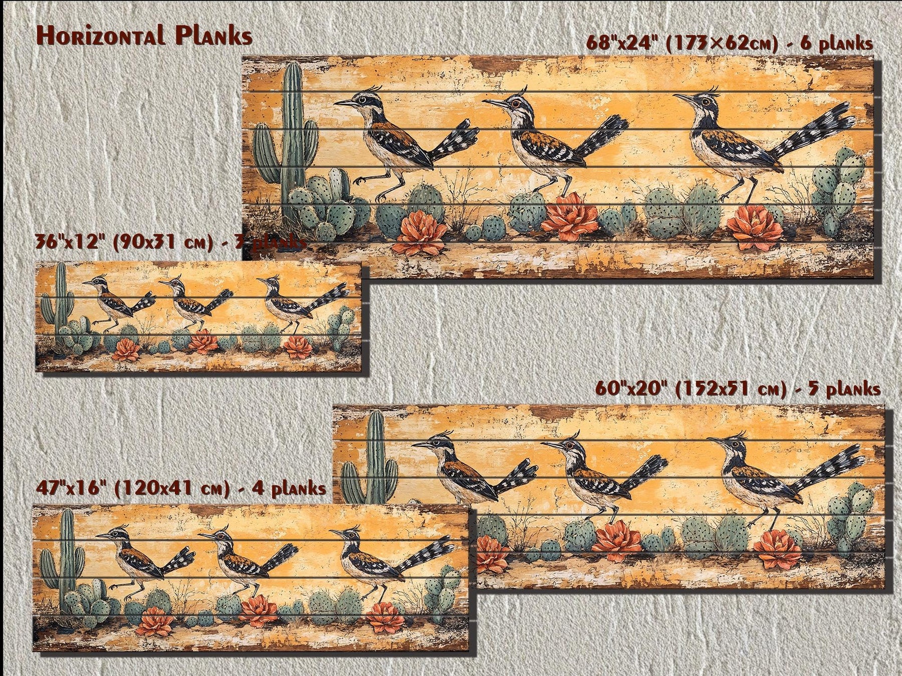 Horizontal wood wall art featuring three roadrunners and cacti in a distressed desert scene.