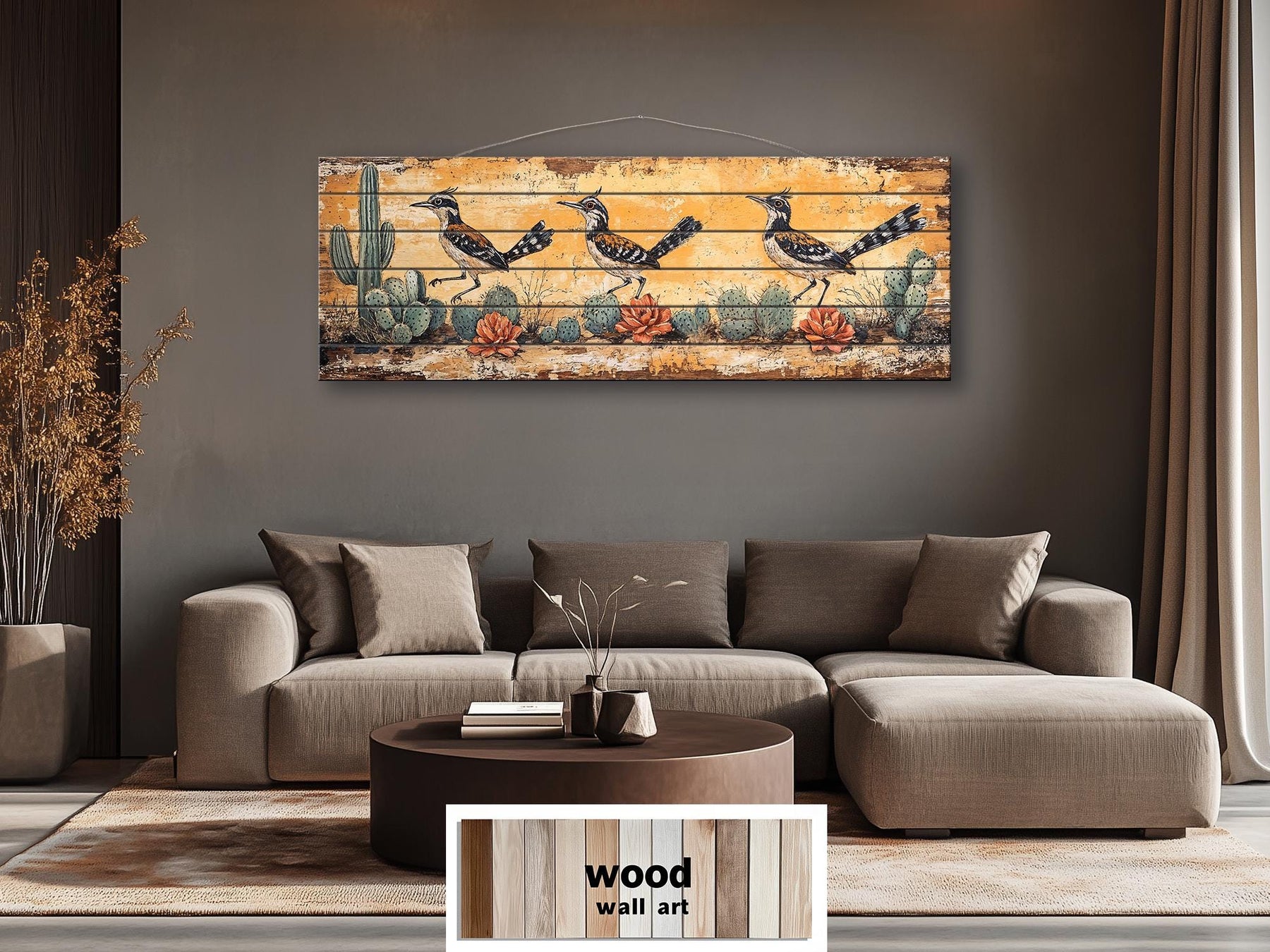 Horizontal wood wall art featuring three roadrunners in a desert scene above a neutral sofa.