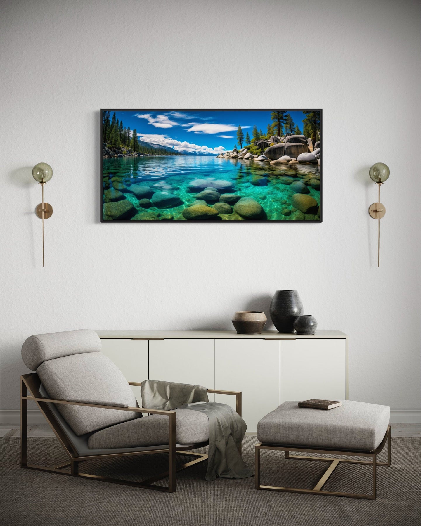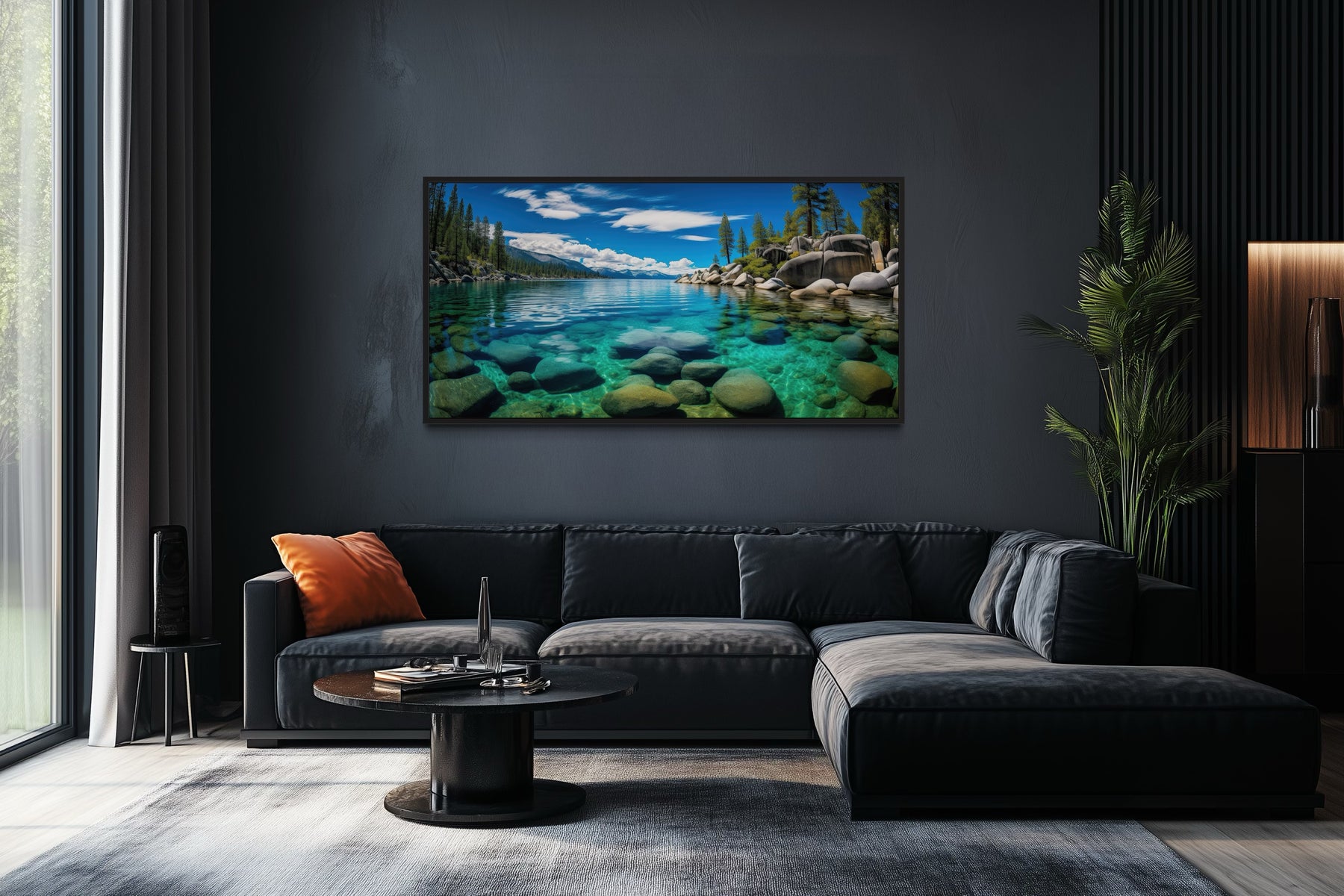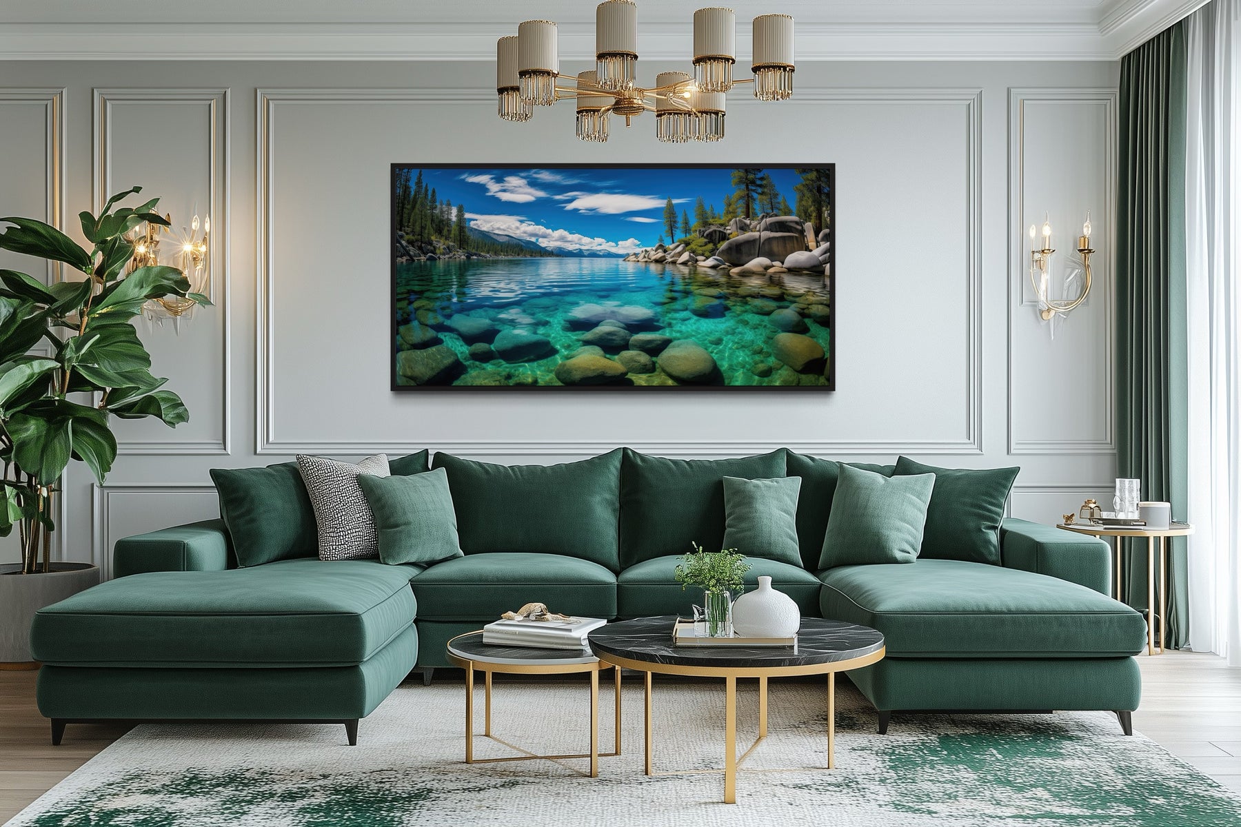The color scheme of this Lake Tahoe painting features vibrant blues, lush greens, and earthy browns, creating a harmonious and lively palette. The crystal-clear blue waters contrast beautifully with the rich greens of the surrounding foliage and the warm browns of the rocks, adding depth and interest to the artwork. Soft whites and greys in the clouds and distant mountains enhance the natural feel, making the scene visually appealing and calming. The use of light and shadow adds dimension and realism, making the landscape appear almost three-dimensional. These colors evoke a sense of tranquility and freshness, perfect for creating a peaceful atmosphere in your home. The vibrant yet natural palette ensures the artwork complements a variety of decor styles, from coastal to contemporary.