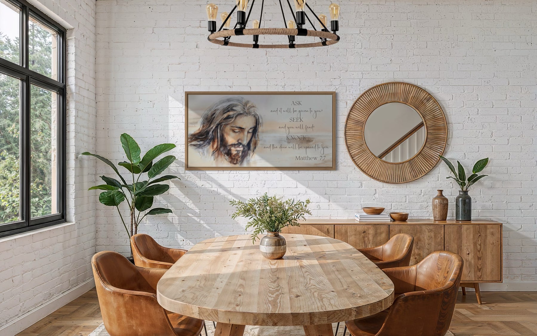 Our Christian scripture wall art is ideal for homes that prioritize a warm and welcoming atmosphere. Its timeless design fits perfectly in prayer rooms, meditation spaces, or family living rooms, where it can inspire moments of reflection. The horizontal format is ideal for placement above mantels, couches, or sideboards, offering a subtle yet powerful focal point. Its neutral tones blend seamlessly with farmhouse, rustic, or even minimalist interiors, adding a touch of grace and elegance. The artwork pairs beautifully with light wood finishes, soft fabrics, and other religious or inspirational decor. For spaces that celebrate faith, it provides both a meaningful message and a striking aesthetic. Transform your home into a haven of peace and inspiration with this Christian scripture wall art featuring Jesus.