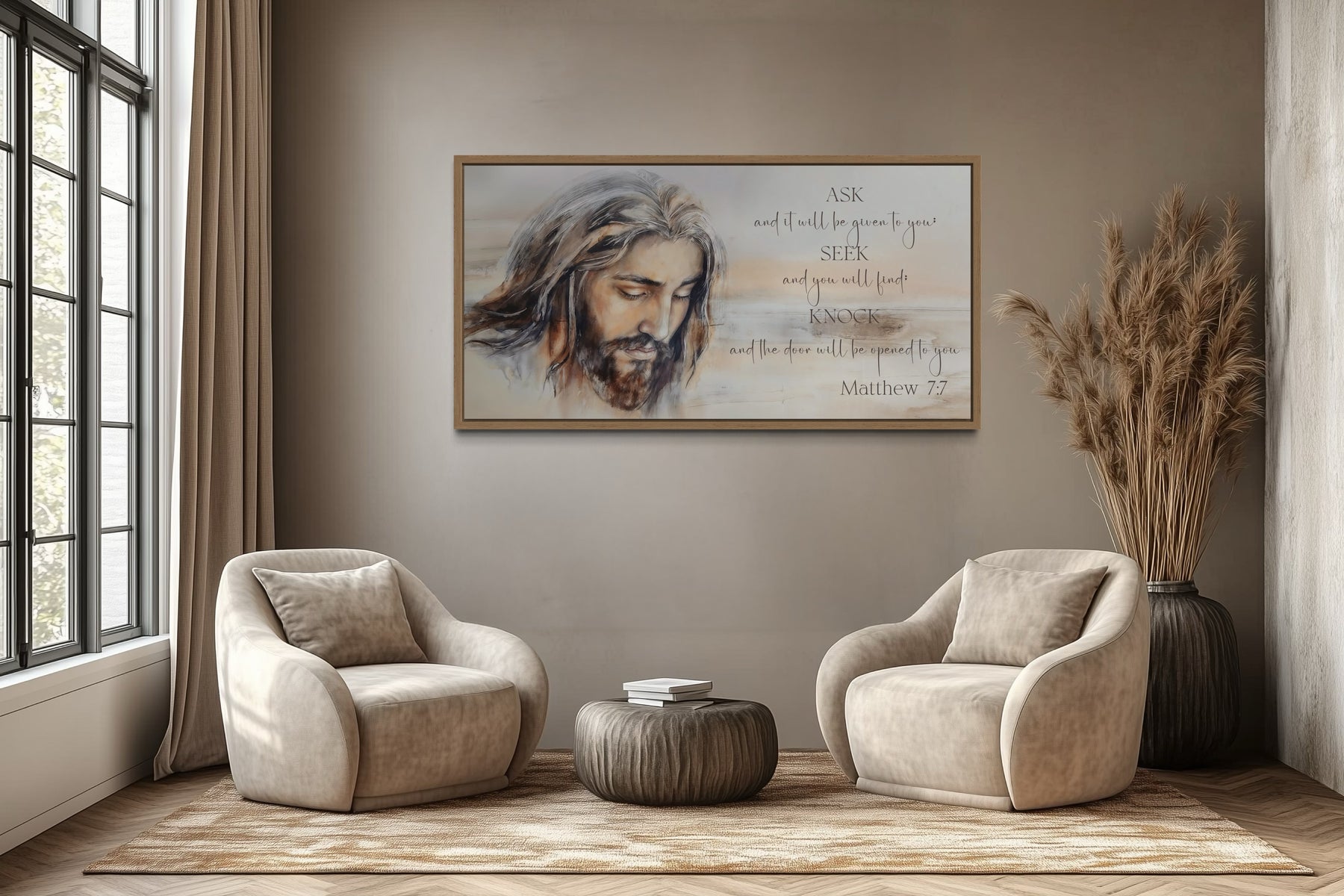 Our scripture wall art canvas featuring Jesus beautifully encapsulates a sense of faith and serenity for your home. This artwork portrays a heartfelt depiction of Jesus in a gentle and reverent pose, set against a soft, muted backdrop. The piece is complemented by the inspiring words, "Ask and it will be given," which add a powerful spiritual message. Designed as a canvas print, its subtle textures and earth tones enhance the timeless and calming essence of the artwork. The detailing in the portrait captures the compassion and grace of Christ, making it a profound focal point for prayer rooms or living spaces. Each element is carefully arranged to bring a sense of peace and inspiration into your daily life. Perfect for those seeking a meaningful connection to their faith, this artwork is both a beautiful expression of spirituality and a stunning decorative addition. Elevate your home with the heartfelt beauty of this scripture wall art canvas featuring Jesus.