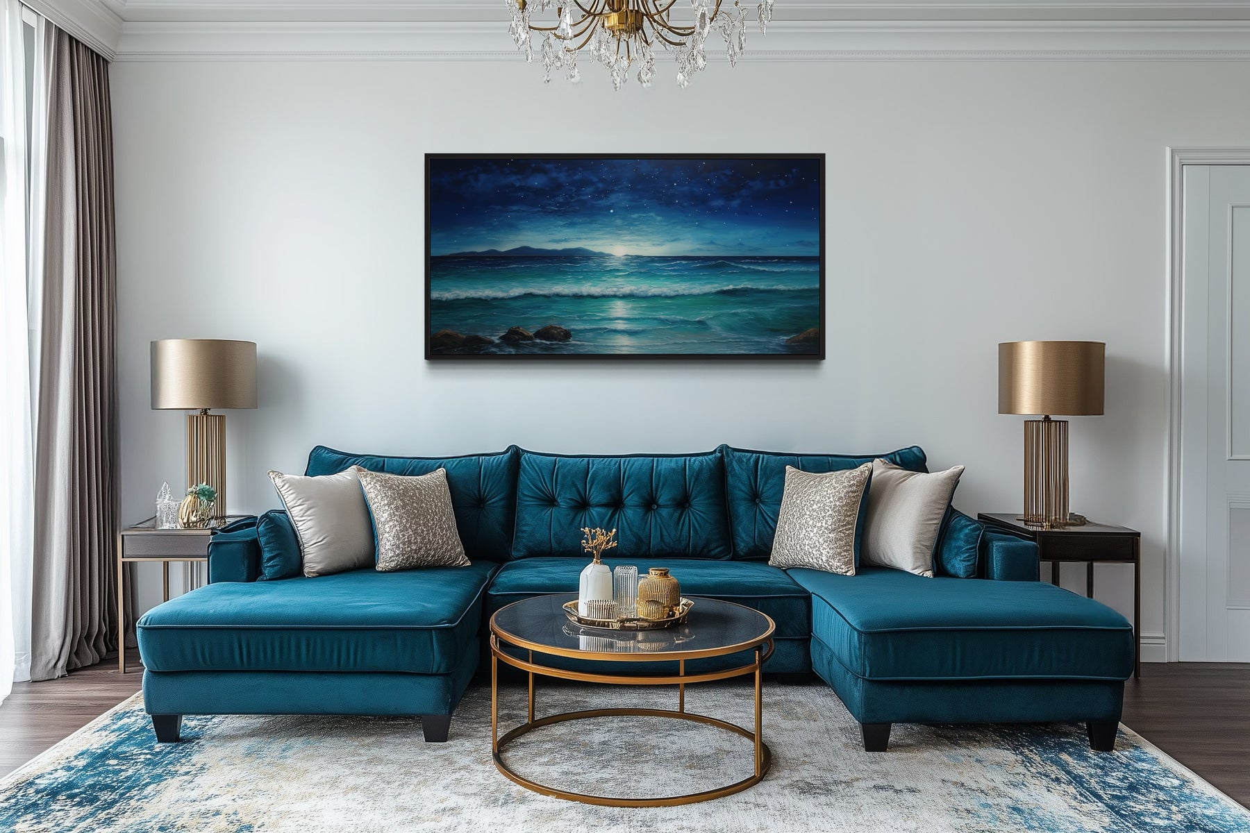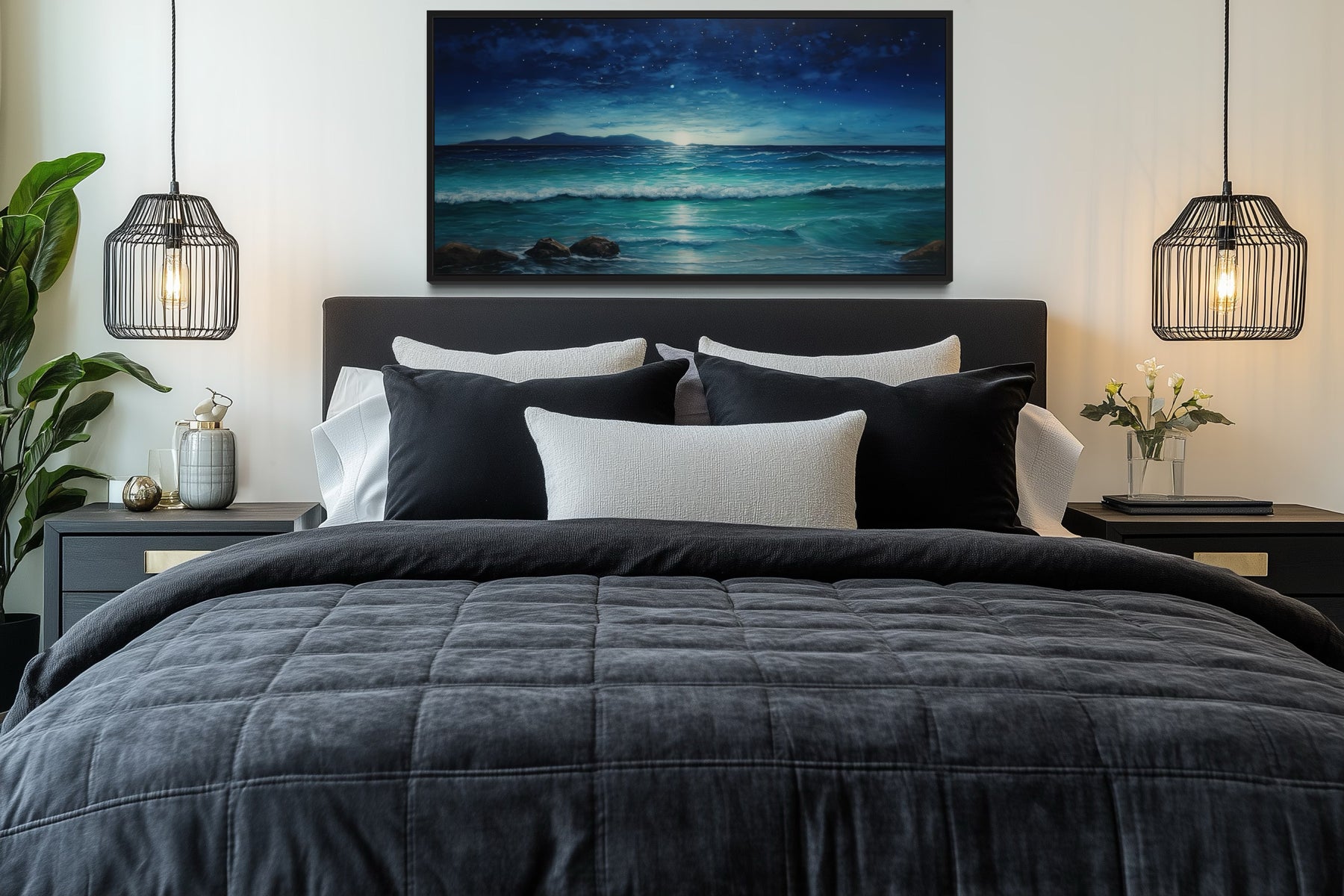 This starry night sky over ocean beach wall art is perfect for nautical, coastal, or minimalist interiors. Its serene composition and soothing tones make it an excellent choice for creating a calming bedroom retreat or a sophisticated living room centerpiece. In nautical-inspired homes, the artwork complements natural textures, light wood furnishings, and sea-inspired accents. For minimalist spaces, the clean lines and bold palette add a touch of understated elegance. Its panoramic format fits beautifully above wide furniture, making it ideal for beds, sofas, or long console tables. Whether styled in a modern home or a seaside retreat, this wall art brings the tranquil beauty of the ocean into your space. Enhance your home with this stunning starry night ocean beach wall art.