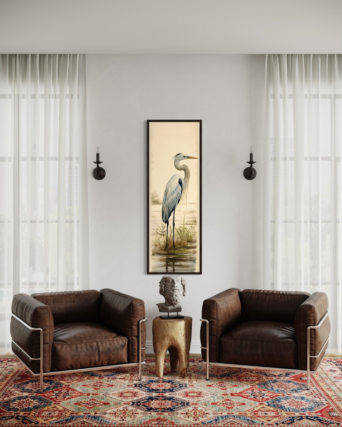 This vertical great egret canvas wall art is a versatile piece, designed to suit a range of home styles, from coastal and nautical themes to minimalist and modern interiors. Its tall, narrow format makes it especially suitable for hallways, small entryways, or areas with limited horizontal space, adding an elegant vertical accent. In a living room, the artwork can serve as a striking focal point, complementing soft, neutral furnishings. For bedrooms or reading nooks, its calming tones and serene imagery help create a peaceful retreat. This wall art is also an excellent choice for office spaces, bringing a touch of nature and sophistication to the work environment. Its coastal aesthetic pairs seamlessly with light, airy decor, but it also provides contrast in darker, moodier interiors. This vertical great egret wall art is a timeless addition to any home, offering a blend of natural beauty and refined style.