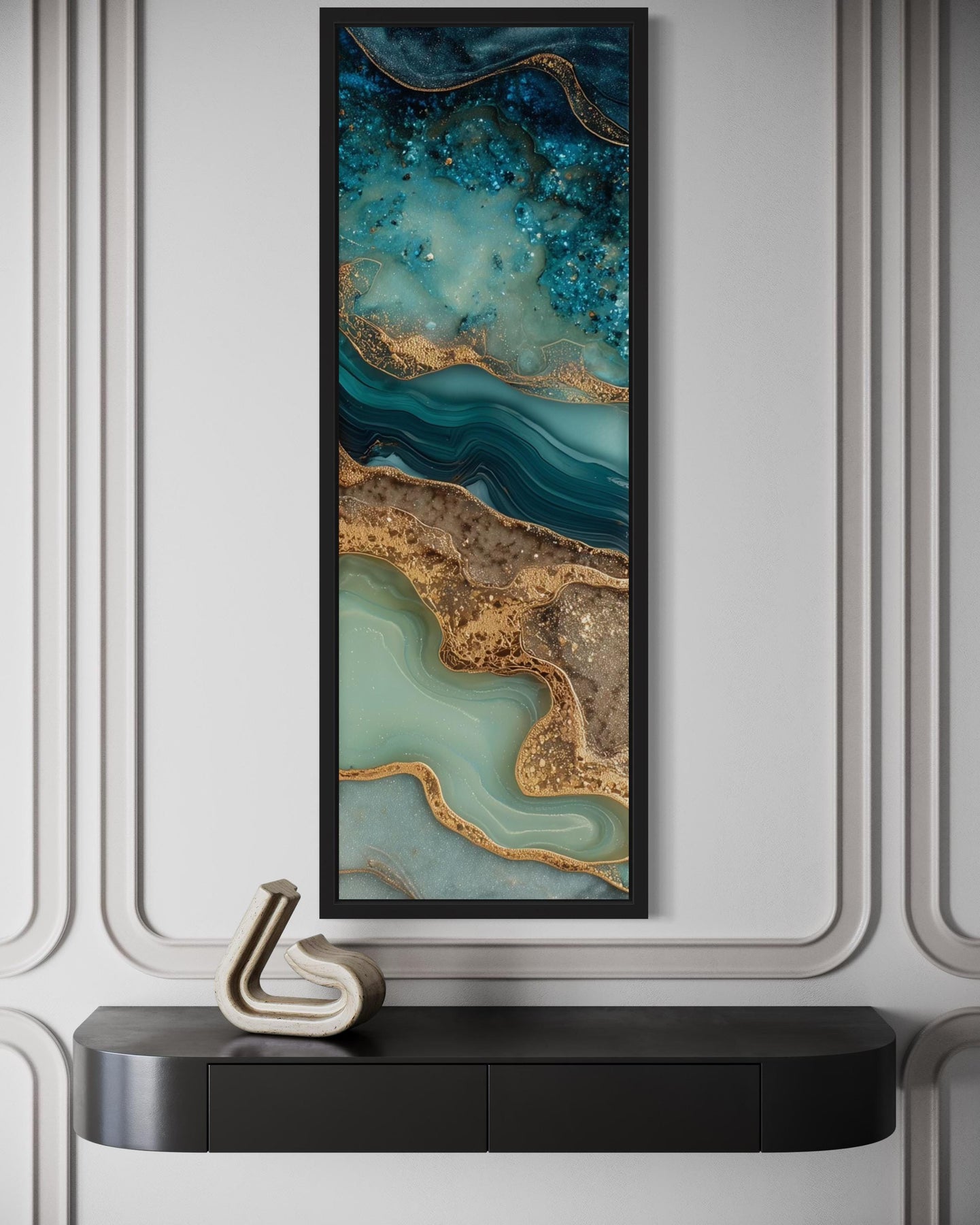 Our Tall Narrow Vertical Abstract Ocean Inspired Teal Blue Gold canvas wall art is defined by its stunning palette that captures both the tranquility and power of the ocean. Rich shades of teal dominate the composition, ranging from deep emerald tones to lighter aqua highlights that reflect the layered beauty of the sea. Darker blues add depth and intensity, grounding the design in a sense of strength and stability. The luminous gold streaks create a dazzling contrast, bringing warmth and elegance to the cooler tones. Soft undertones of beige and sandy hues suggest a shoreline influence, tying the piece back to its natural inspiration. This Tall Narrow Vertical painting achieves harmony by blending cool aquatic shades with warm metallic highlights, making it versatile and dynamic. The gold accents shimmer against the teal and blue, creating visual movement and luxury. Subtle gradients between light and dark enhance the abstract forms, adding a sense of motion like waves rolling across the canvas. The balance of colors makes the artwork adaptable to many interiors while still feeling bold and unique. Our Tall Narrow Vertical wall art achieves an ocean-inspired palette that feels tranquil, sophisticated, and endlessly captivating.