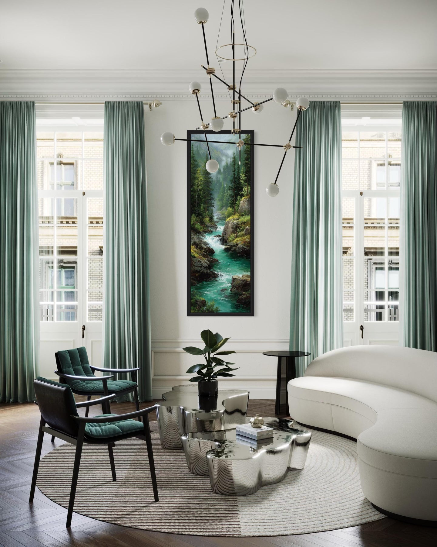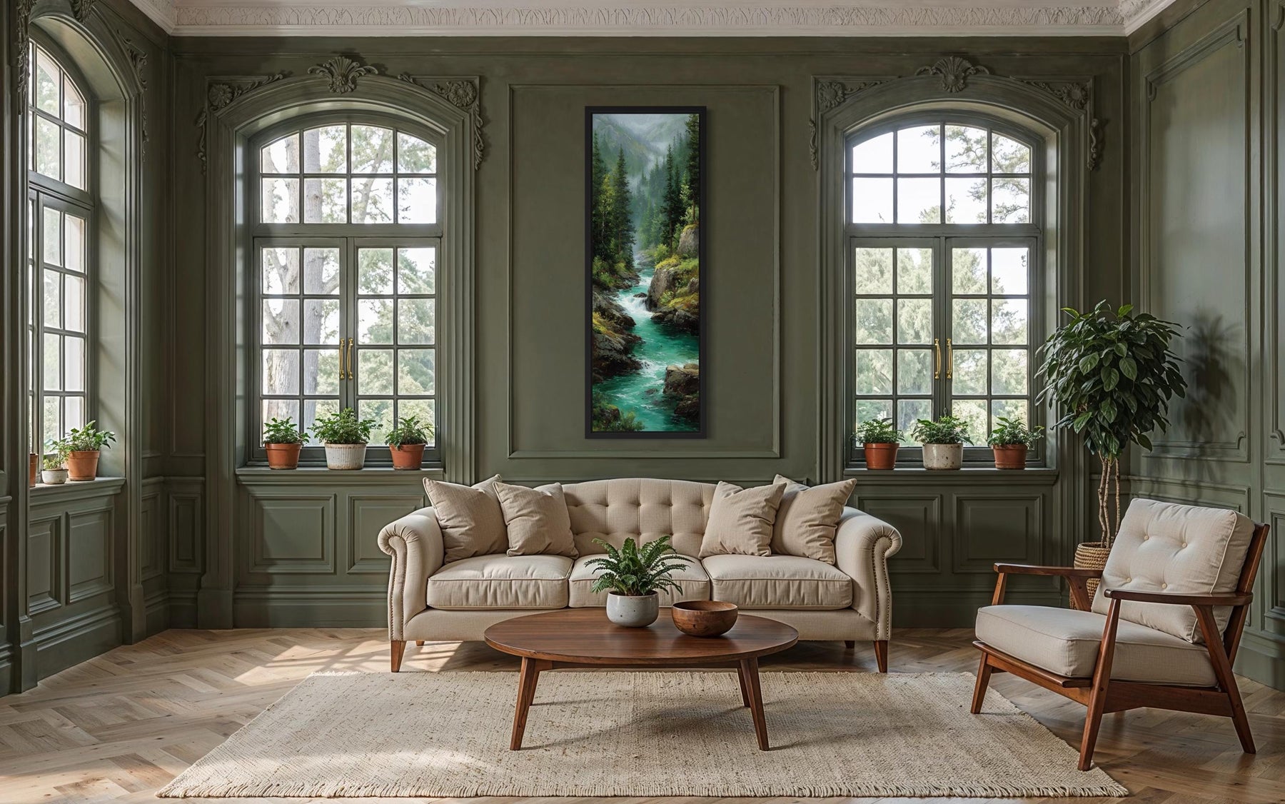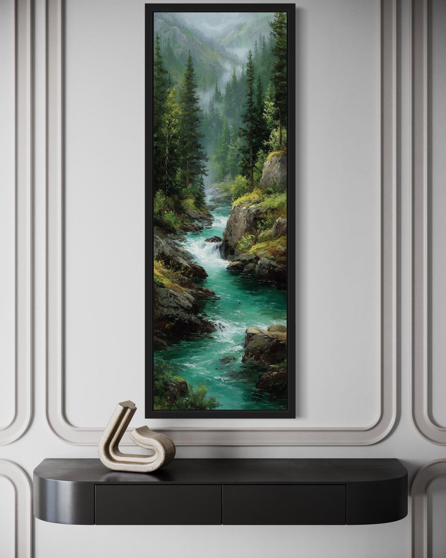 This mountain river wall art features a rich, refreshing palette designed to evoke the cool stillness of forest and stream. Deep pine and emerald greens dominate the evergreen trees, while soft moss tones appear in the shaded rocks and riverbanks. Vivid yet natural blues highlight the rushing water, accented by pale aquamarine where sunlight strikes the current. Gentle misty grays and soft whites add atmosphere to distant peaks, creating a sense of depth and morning fog. Warm touches of earthy brown and muted ochre appear in the exposed stones and tree trunks, grounding the scene with natural textures. Subtle hints of golden sunlight flicker across the surface, suggesting a quiet dawn breaking over the mountains. This interplay of cool and warm shades creates visual balance, making the painting feel both energizing and soothing. As daylight changes, the greens deepen and the blues shift, revealing new layers of color and movement. The result is a dynamic yet peaceful color story that remains captivating through every season. With its harmonious blend of vibrant greens, clear blues, and soft natural neutrals, the tall narrow vertical mountain river canvas print enriches any space with timeless outdoor beauty.