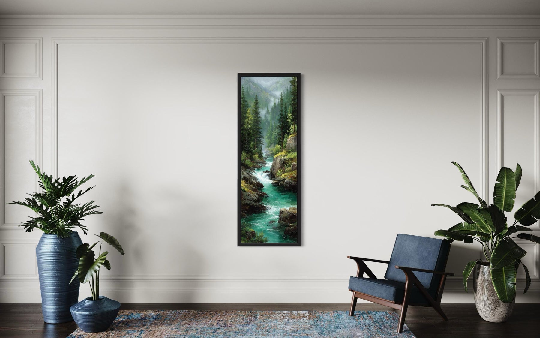 This tall narrow vertical mountain river canvas print is perfect for nature-inspired interiors and rustic modern homes seeking a connection to the outdoors. In a mountain cabin or lodge, it mirrors the scenery outside, enhancing the feeling of being surrounded by forest and flowing streams. In urban or contemporary spaces, it introduces a refreshing touch of wilderness, bringing calm and natural energy to living rooms, studies, or reading nooks. Its vertical format makes it especially suited for hallways, stairwells, and other architectural spaces that benefit from artwork with graceful height. The natural palette complements wood beams, stone fireplaces, and neutral furnishings, tying together indoor comfort with outdoor grandeur. Whether displayed as a solitary focal point or combined with other landscape art, it creates a tranquil retreat that invites reflection and relaxation. Collectors of landscape paintings and lovers of outdoor adventures will appreciate its meticulous detail and enduring design. Even in minimalist modern rooms, it provides a vivid counterpoint that softens clean lines with organic movement. Every glance at the flowing water and distant peaks offers a moment of quiet escape. This tall narrow vertical mountain river wall art completes your décor with serene wilderness charm and timeless natural elegance.