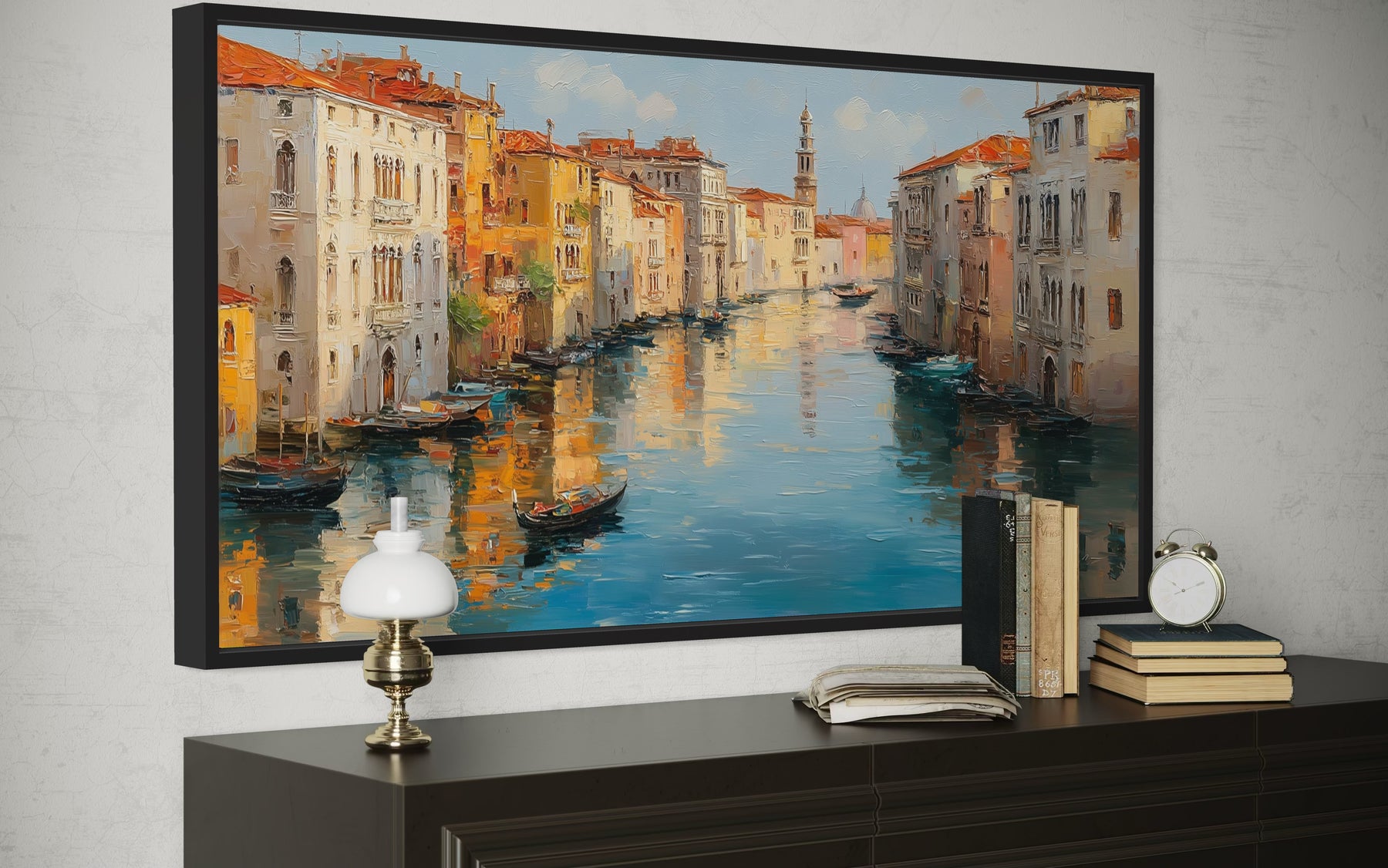 This Grand Canal artwork was designed for refined interiors that seek charm, elegance, and a hint of European romance. It’s especially well-suited for living rooms, formal dining spaces, or master bedrooms where a serene atmosphere is desired. The panoramic format fits beautifully above long furniture—such as sofas, headboards, or buffets—and creates an instant focal point with a story. Ideal for homes that blend modern style with classical touches, this piece complements spaces with velvet seating, crystal lighting, or arched mirrors. The old-world subject matter and soft finish also work well in travel-themed rooms, gallery walls, or cozy reading nooks filled with wanderlust. If your home embraces warm neutrals, fine textures, and atmospheric art, this piece adds the final touch of grace and global charm. It’s also an excellent choice for Airbnb properties or hospitality settings aiming to elevate their aesthetic with world-famous scenery. Subtle yet luxurious, the composition brings timeless tranquility without overpowering its environment. Our Grand Canal artwork is a celebration of Venice's heart, perfectly suited for homes with elegance in their soul.