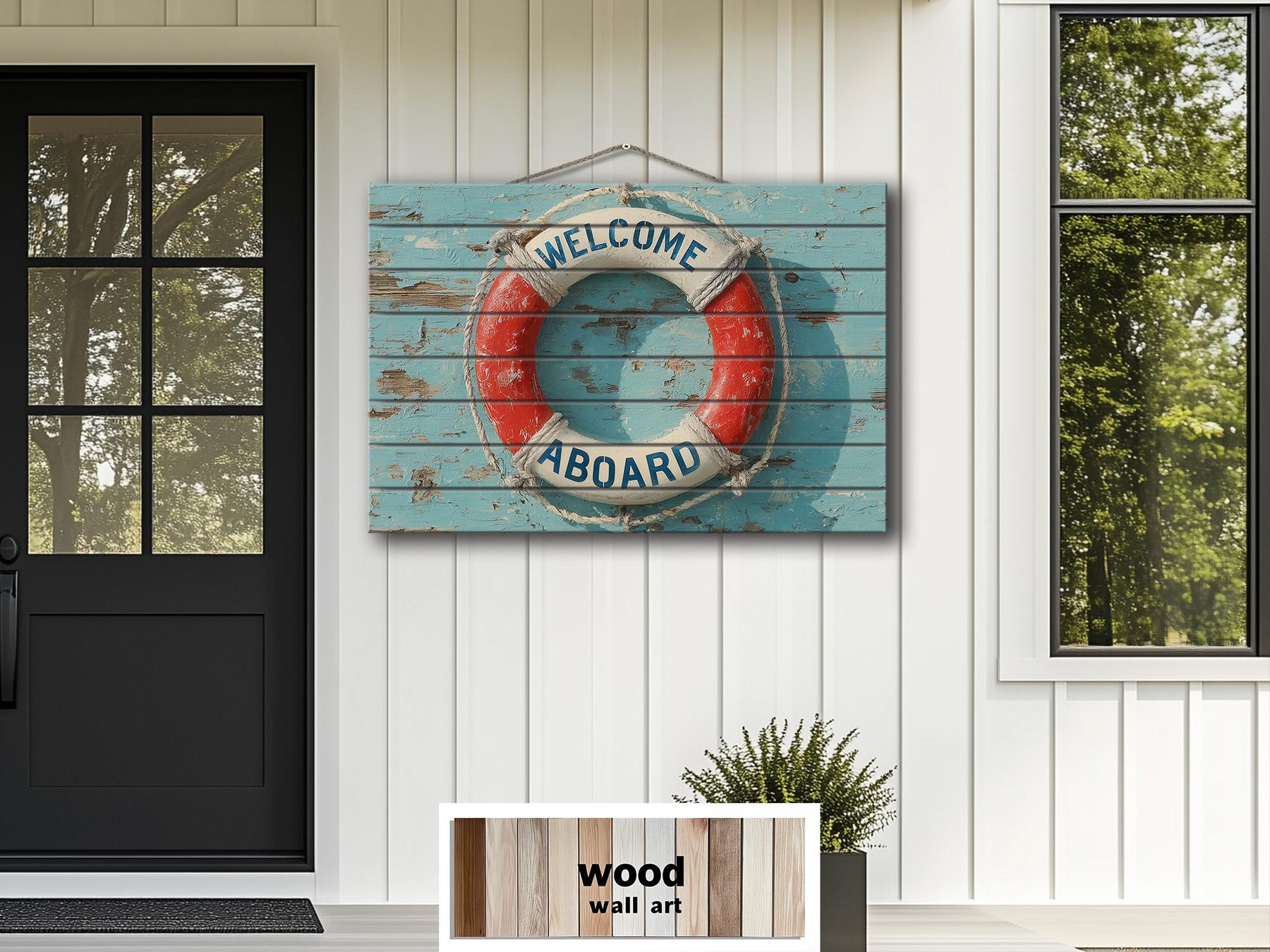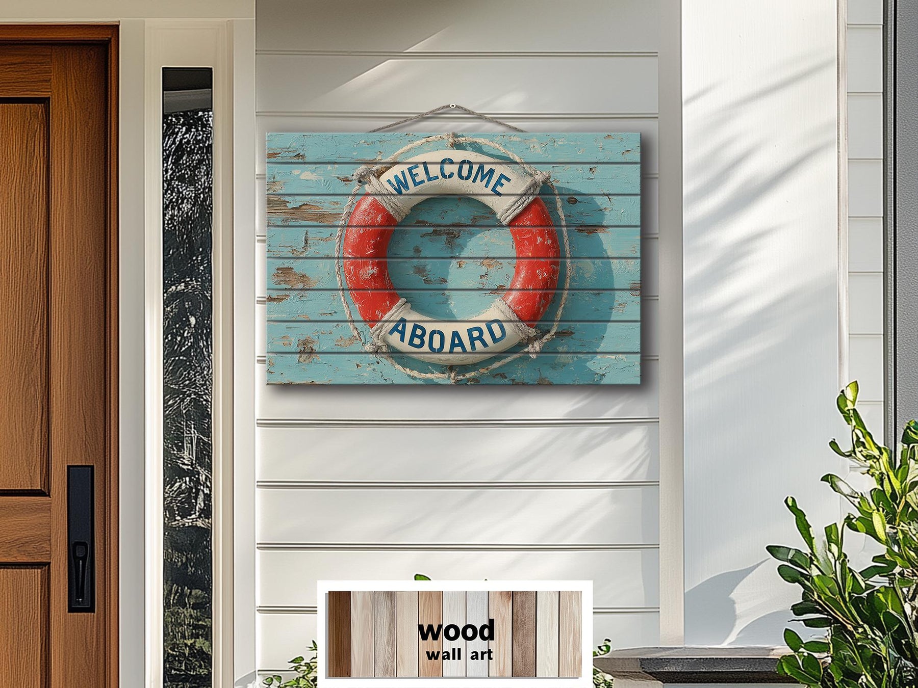 This piece is created for coastal entryways and beach house living rooms, yet it also feels completely natural in covered patio settings and pool areas where the nautical motif connects instantly with water, sunlight, and relaxed architecture. Hung above a bench where guests leave towels or above a sofa facing large windows, the elongated format mirrors the horizon and visually expands the room. The real wood panel gives it the substance needed to sit comfortably against shiplap, beadboard, light stucco, or painted brick without feeling lightweight. In a poolside lounge space it echoes the look of real marina signage and turns the wall into a destination point rather than a background. Surrounded by jute rugs, woven baskets, striped textiles, and light wood furniture, the lifebuoy becomes part of a cohesive coastal story. The welcoming message of Welcome Aboard makes it especially suited for spaces where people gather, arrive, and unwind. Its sun-washed palette reflects beautifully in natural daylight and complements interiors that open directly to outdoor decks or water views. In a beach house living room it introduces personality while keeping the atmosphere calm and airy. Near a pool it feels playful, authentic, and perfectly in place with the surrounding blue tones and bright surfaces. This Welcome Aboard Lifebuoy Distressed Wood Wall Art belongs in interiors that celebrate ocean air, open doors, and the effortless rhythm of waterfront living.