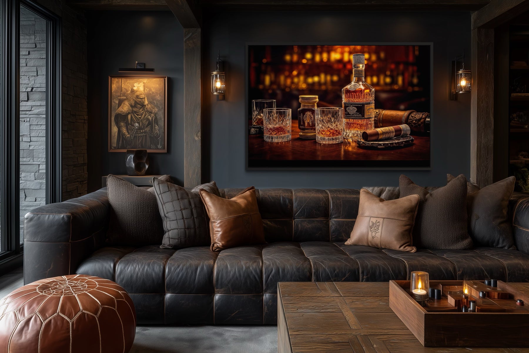 This whiskey and cigar canvas print is the perfect addition to man caves, home bars, billiards rooms, or basements designed for entertaining and leisure. Its masculine tones and elegant composition make it ideal for creating a sophisticated atmosphere in spaces dedicated to relaxation or socializing. Whether you're decorating a traditional or modern home, this piece complements rustic, industrial, or contemporary decor styles, offering versatility in placement. The artwork fits beautifully over a leather couch, a bar counter, or even in a dining room where fine drinks are enjoyed. For those looking to add a touch of class and personal style to their home, this canvas print delivers the perfect combination of luxury and relaxation. Ready to hang, it serves as a stylish and timeless statement piece for any space dedicated to enjoying life’s finer pleasures.
