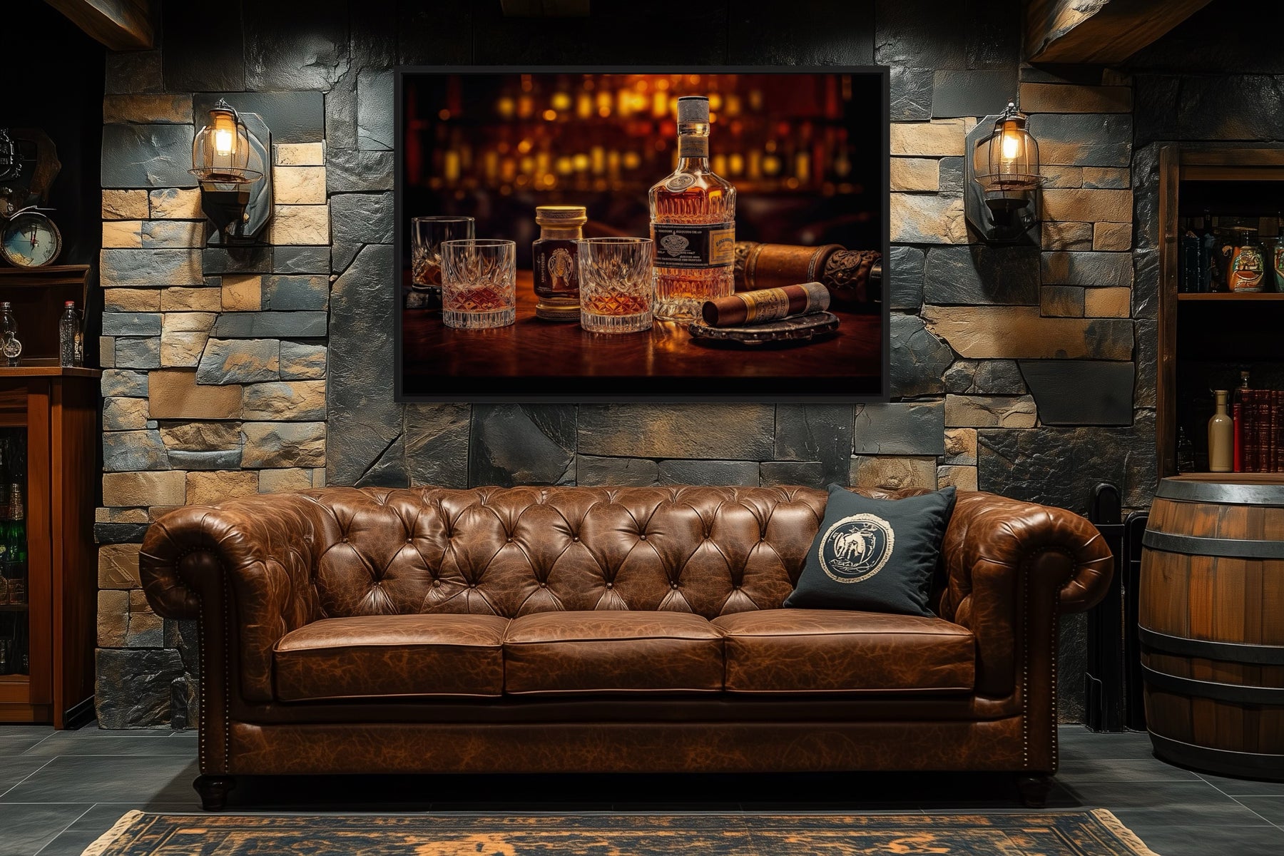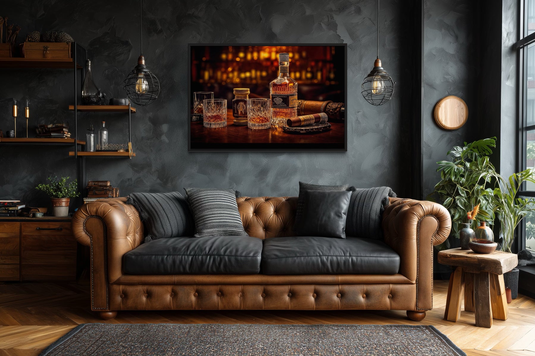 Whiskey And Cigar Framed Canvas Wall Art For Man Cave Or Home Bar