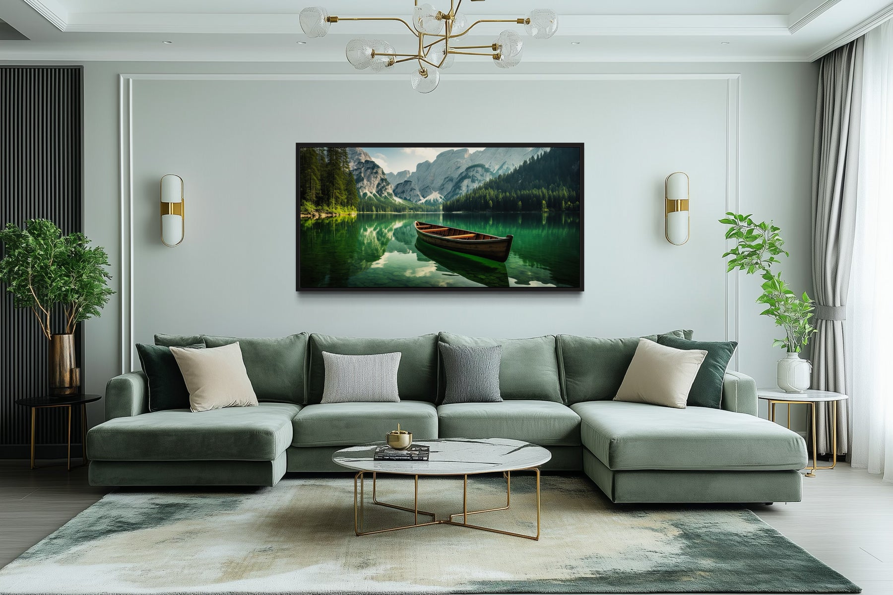 Our wooden canoe in emerald green lake wall art brings the calming beauty of the wilderness into your home. This framed canvas showcases a wooden canoe gently floating on the reflective surface of a deep emerald green lake, surrounded by towering mountains and lush foliage. The serene stillness of the water mirrors the grandeur of nature, creating a peaceful scene that feels both timeless and restorative. The delicate play of light and shadows adds depth, immersing you in the tranquility of this alpine escape. The natural wood tones of the canoe lend a rustic charm, balancing perfectly with the vibrant greens and soft blues of the landscape. This artwork invites you to pause and reflect, making it an ideal addition for spaces designed for relaxation. Elevate your interiors with this emerald green lake wall decor, where rustic simplicity meets the elegance of nature.