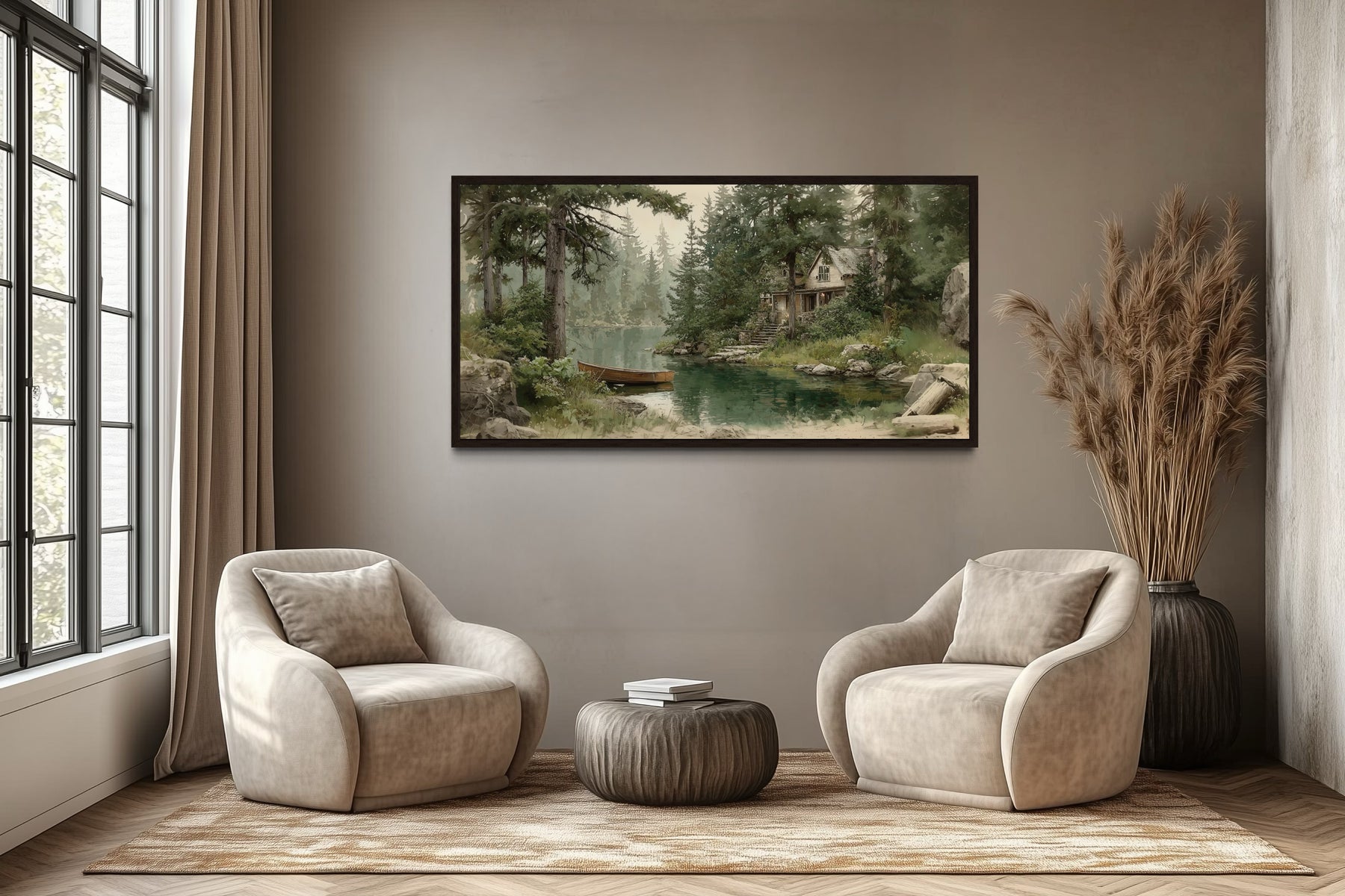 The colors in this wooden boat painting highlight the serene beauty of natural landscapes. Gentle hues of green dominate the backdrop, representing the lush foliage surrounding the lake. Subtle browns and warm beige tones define the wooden canoe, adding a rustic charm and grounding the composition. Soft blues and grays capture the stillness of the water, with hints of white reflecting light to enhance the overall calmness of the scene. Muted earthy tones bring a harmonious balance, ensuring the artwork blends seamlessly into rustic or neutral-themed interiors. Delicate golden accents mimic sunlight breaking through the trees, adding a warm glow. This carefully curated palette creates an inviting and serene atmosphere. Transform your space with the gentle yet striking tones of this rustic cabin wall decor.
