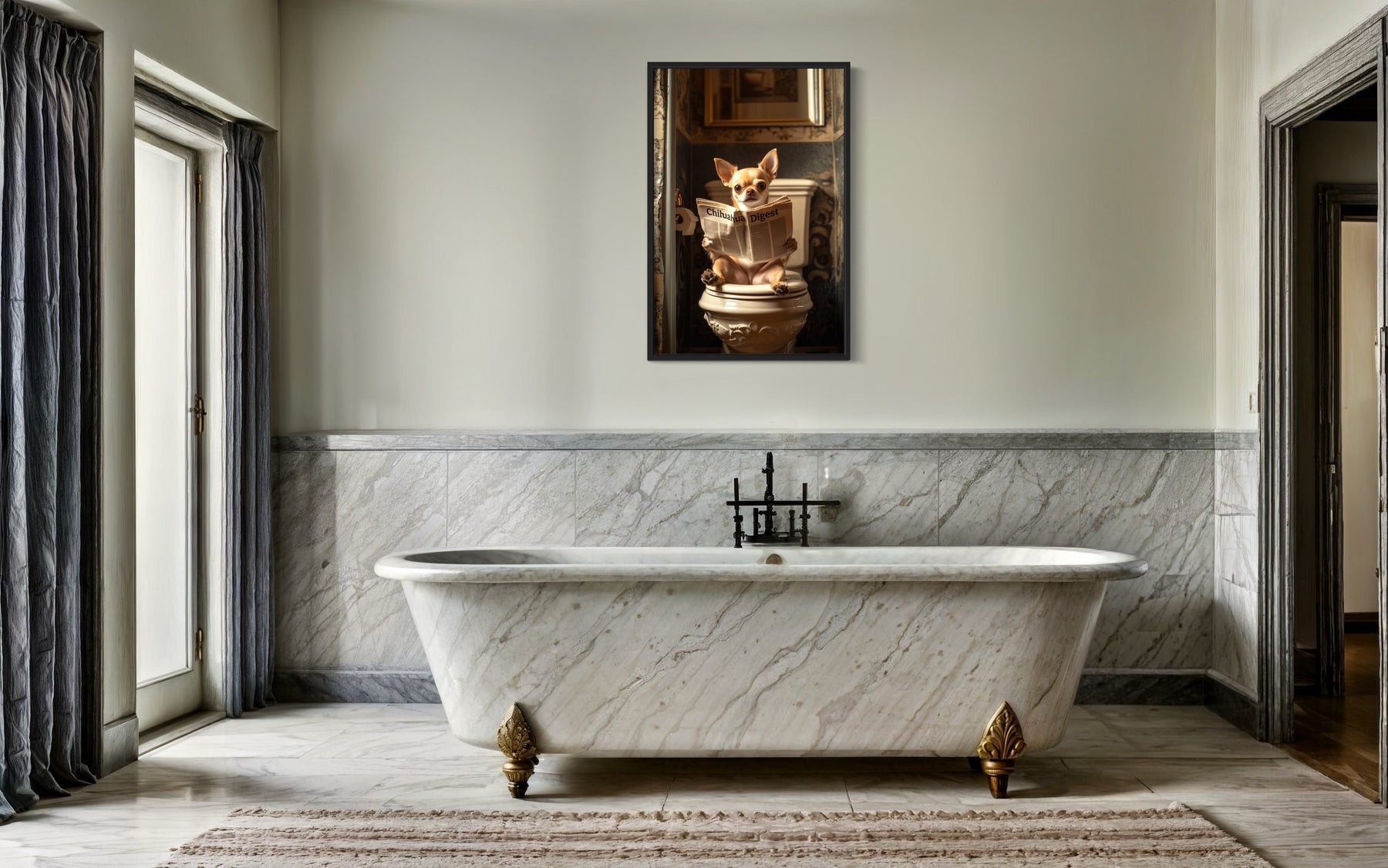 Elevate your bathroom decor with this humorous Chihuahua on toilet picture, featuring a playful depiction of a Chihuahua reading a newspaper while perched on a toilet. This quirky and imaginative artwork is a perfect conversation starter, adding a lighthearted charm to your space. It blends a touch of humor with artistic detail, making it ideal for pet lovers and anyone who enjoys unique bathroom decor. The Chihuahua’s expressive pose and the whimsical theme create a standout piece that combines functionality with personality. Whether you’re looking to brighten a guest bathroom or add a fun twist to your own, this artwork makes an unforgettable impression. Designed to bring laughter and style, the Chihuahua on toilet canvas print is as entertaining as it is decorative. Add this delightful piece to your walls and let your bathroom become a space that sparks joy and conversation.