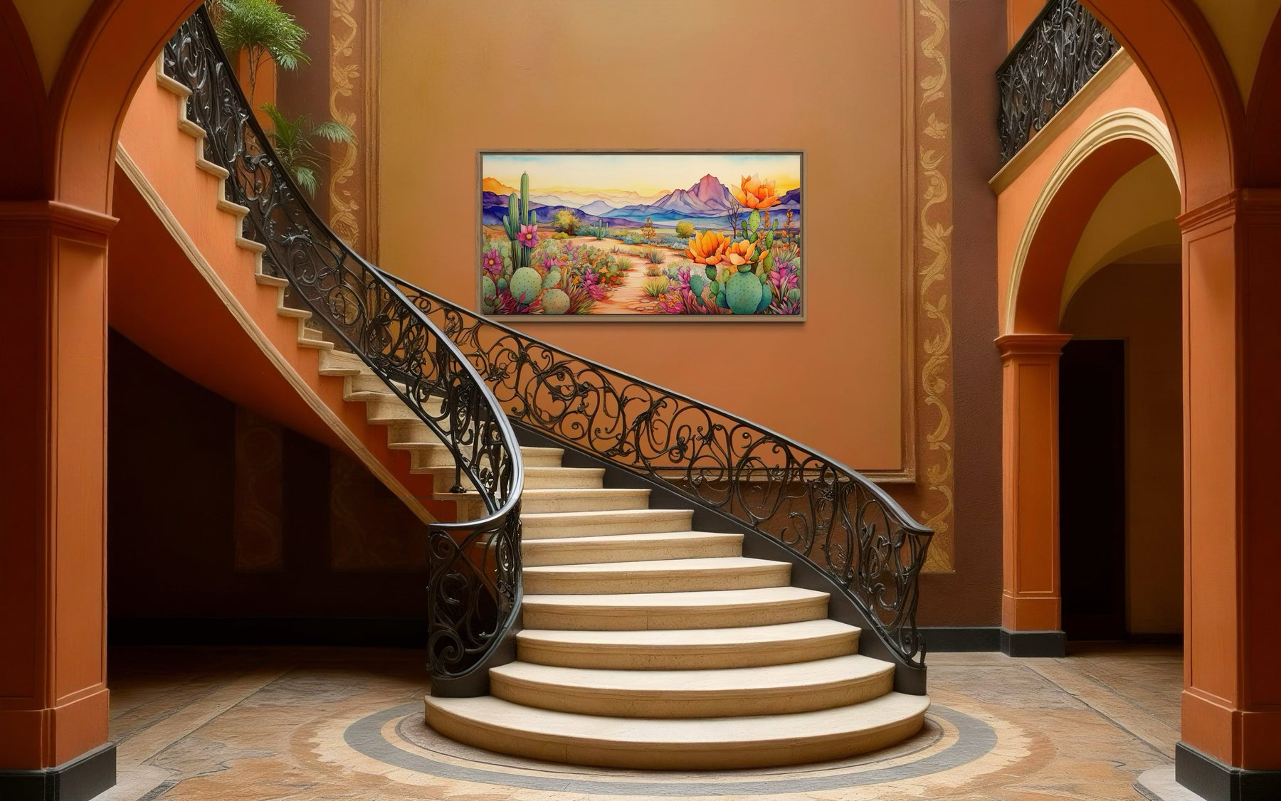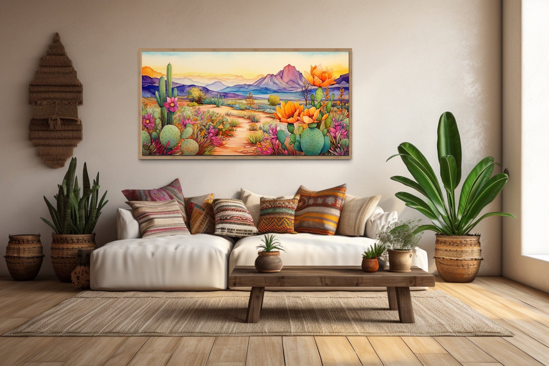 Our Southwestern desert wall decor is the perfect addition to spaces that embrace bold design and natural beauty. Ideal for living rooms, dining areas, or entryways, its horizontal layout and vivid palette create a stunning focal point. The vibrant colors pair seamlessly with rustic furnishings, natural wood tones, and earth-inspired accents, enhancing the warmth and character of the room. For modern homes, it adds a touch of Southwestern charm, providing contrast and depth to minimalist interiors. This artwork works wonderfully in open spaces with natural light, where its bold colors can truly shine. It’s particularly well-suited for homes with a desert or bohemian theme, complementing indoor plants and woven textures. Bring the majesty of the Arizona desert into your space with this Southwestern desert wall decor.