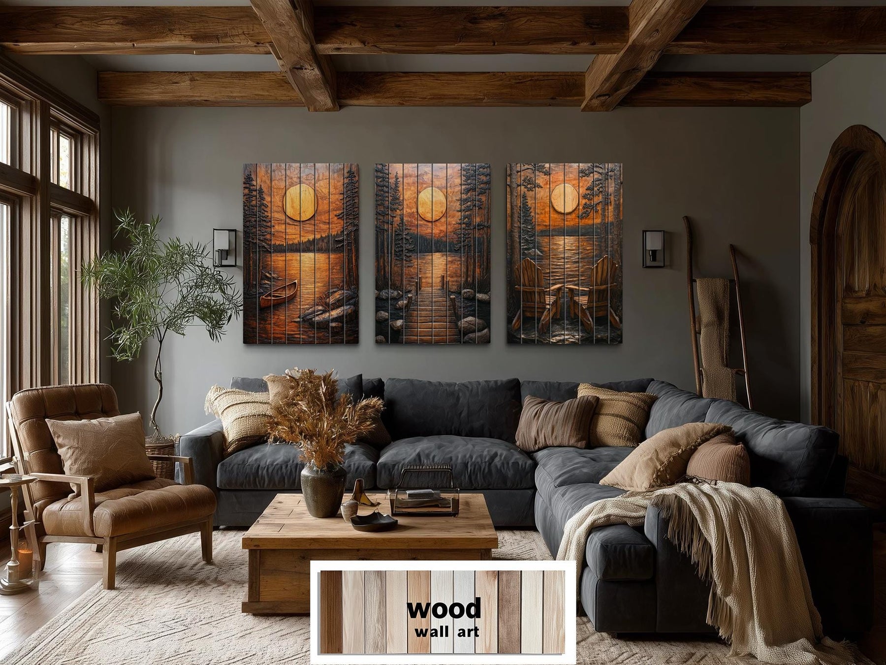This Lake House Rustic Cabin Decor wall decor is especially suited for a lakeside cabin living room or a cozy lodge-style den where warm natural materials define the interior. Mounted above a sofa, fireplace mantel, or wooden console, the three-panel arrangement becomes a calming focal point that reflects the atmosphere of a quiet lakeside evening. In a cabin living room with timber beams, leather seating, and woven textiles, the distressed wood wall art blends naturally with the surrounding textures. The warm sunset tones complement wooden furniture, stone fireplaces, and soft neutral fabrics often used in cabin interiors. The three coordinated scenes spread horizontally across the wall, creating a panoramic lakeside view that expands the visual depth of the room. Guests entering the space immediately recognize the familiar symbols of lake life through the fishing dock, canoe, and Adirondack chairs. The peaceful imagery reinforces the relaxed lifestyle associated with cabins and lake houses. Rustic interiors built around nature themes often benefit from artwork that echoes the surrounding landscape. A cozy cabin environment inspired by quiet evenings on the water feels complete with this Lake House Rustic Cabin Decor distressed wood wall art.