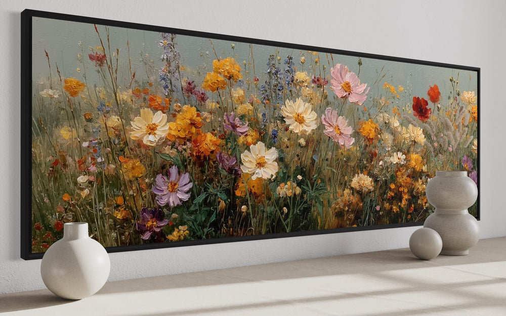 Our wild flowers wall decor is ideal for living rooms, modern farmhouse interiors, or transitional spaces that embrace bold color and soft rustic charm. Its long horizontal design makes it perfect for hanging above a couch, over a buffet, or behind a dining table, where it balances the length of furniture with floral movement. In farmhouse homes with natural wood furniture, woven textures, and soft cream walls, this piece feels right at home while adding a vibrant touch. The floral design feels fresh yet nostalgic, like a garden in full bloom captured in evening light. It’s equally suited to more modern settings where a statement piece is needed to soften hard lines and add character. Placed in bright spaces with white walls, it pops beautifully and becomes the soul of the room. In darker rooms, the deep background of the painting blends in while the colors push forward, giving it a dramatic, cozy vibe. It works especially well in homes that balance minimalism with warm, collected style. Our wild flowers wall decor brings bold garden beauty into both rustic and refined spaces.