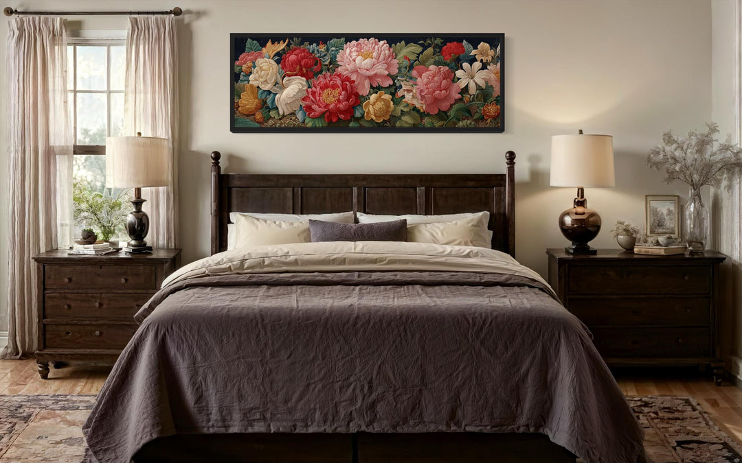 Our antique floral tapestry wall art is a beautifully detailed long horizontal framed canvas that showcases an exquisite vintage arrangement of peonies and roses. This piece celebrates 19th-century floral design with a moody, dramatic background that allows every petal and leaf to feel rich, dimensional, and full of romance. The central flowers bloom in various stages—some fully open, others delicately cupped—capturing the natural rhythm and softness of real-life bouquets. Rich reds, dusty pinks, and muted ivory tones dance across the composition, their vibrancy deepened by the dark charcoal and espresso backdrop. The frame adds structure and elegance, turning the artwork into a refined tapestry-style centerpiece that feels collected rather than newly purchased. With its painterly style and timeless florals, the piece evokes the luxury of antique textiles and the allure of a historic salon or manor. Every brushstroke and color transition tells a story of aging beauty, preserved elegance, and classic craftsmanship. It’s the kind of wall decor that feels like it holds secrets, history, and whispered conversations in candlelit rooms. Our antique floral tapestry wall art invites intimacy and vintage splendor into the spaces it adorns.