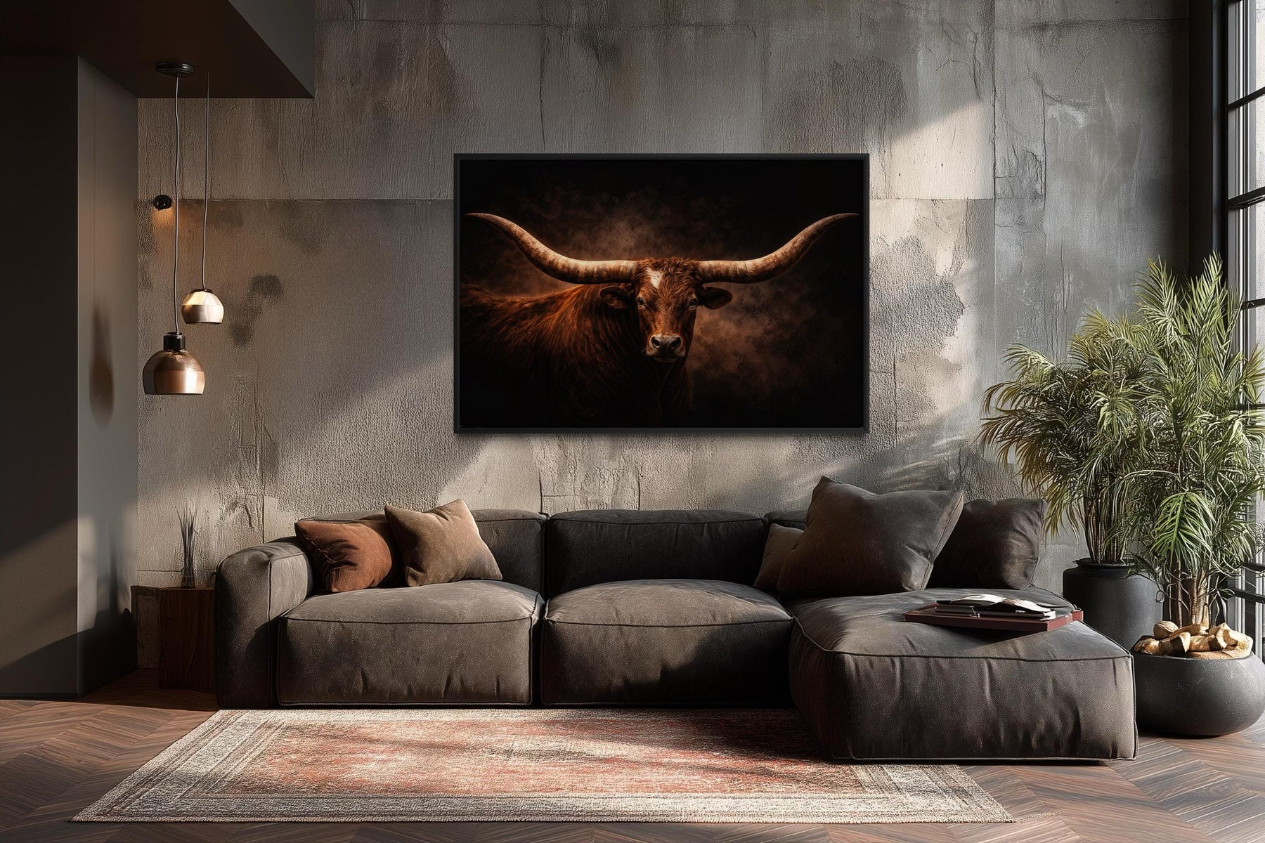 The color palette is built around deep charcoal, espresso brown, and smoked black tones that create a moody backdrop and allow the illuminated steer to stand forward with intensity. Warm amber and burnt sienna highlights trace along the horns and face, producing a fire-lit glow that adds depth and richness. Subtle bronze undertones give the artwork a refined warmth that pairs naturally with leather furniture and wood textures. The restrained use of light keeps the scene dramatic and masculine rather than overly bright. Soft gradients in the shadows create dimension and prevent the background from feeling flat. These tones echo the natural colors of ranch materials such as saddle leather, aged timber, and iron hardware. The glow around the subject adds a sense of depth that makes the canvas feel larger than its physical size. Neutral dark hues ensure the piece integrates easily into existing western interiors. The contrast between light and shadow enhances the sculptural form of the steer. This balanced palette defines the mood of longhorn bull wall decor.
