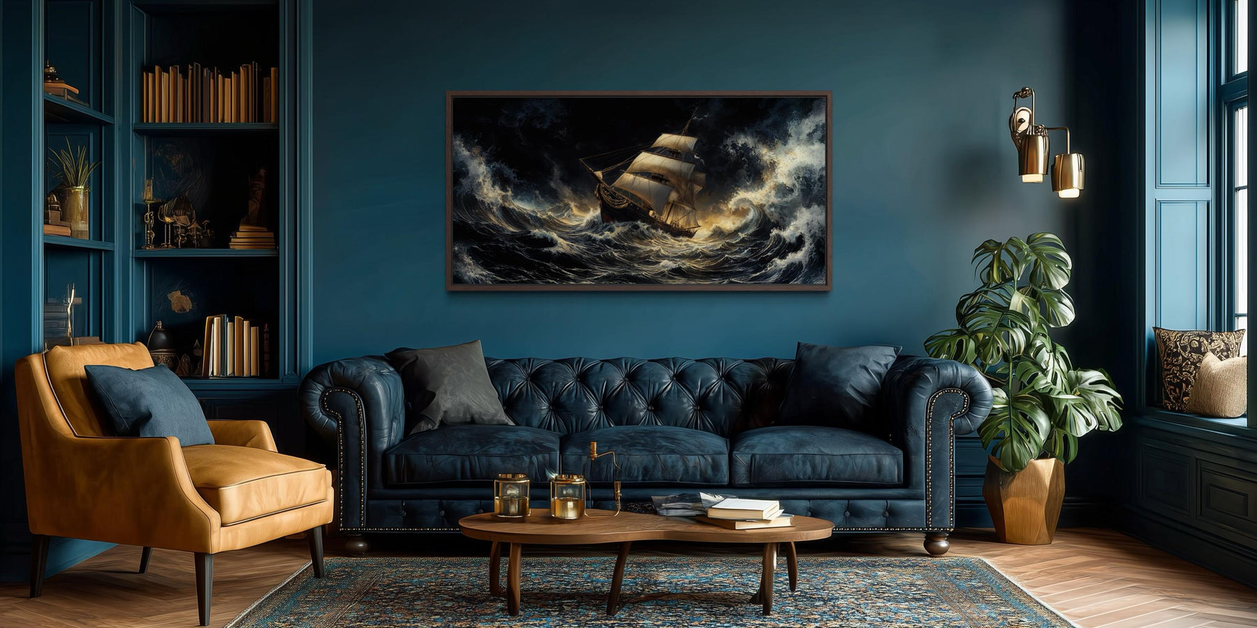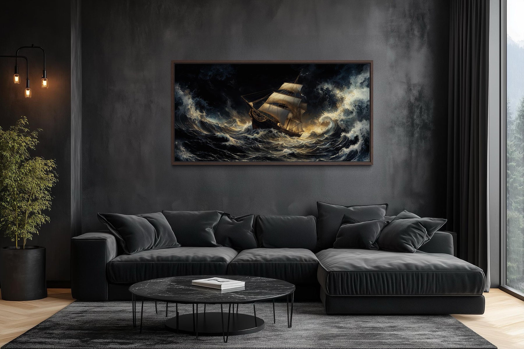 Stormy sailing ship wall art featuring dramatic ocean waves in a dark, moody living room setting.