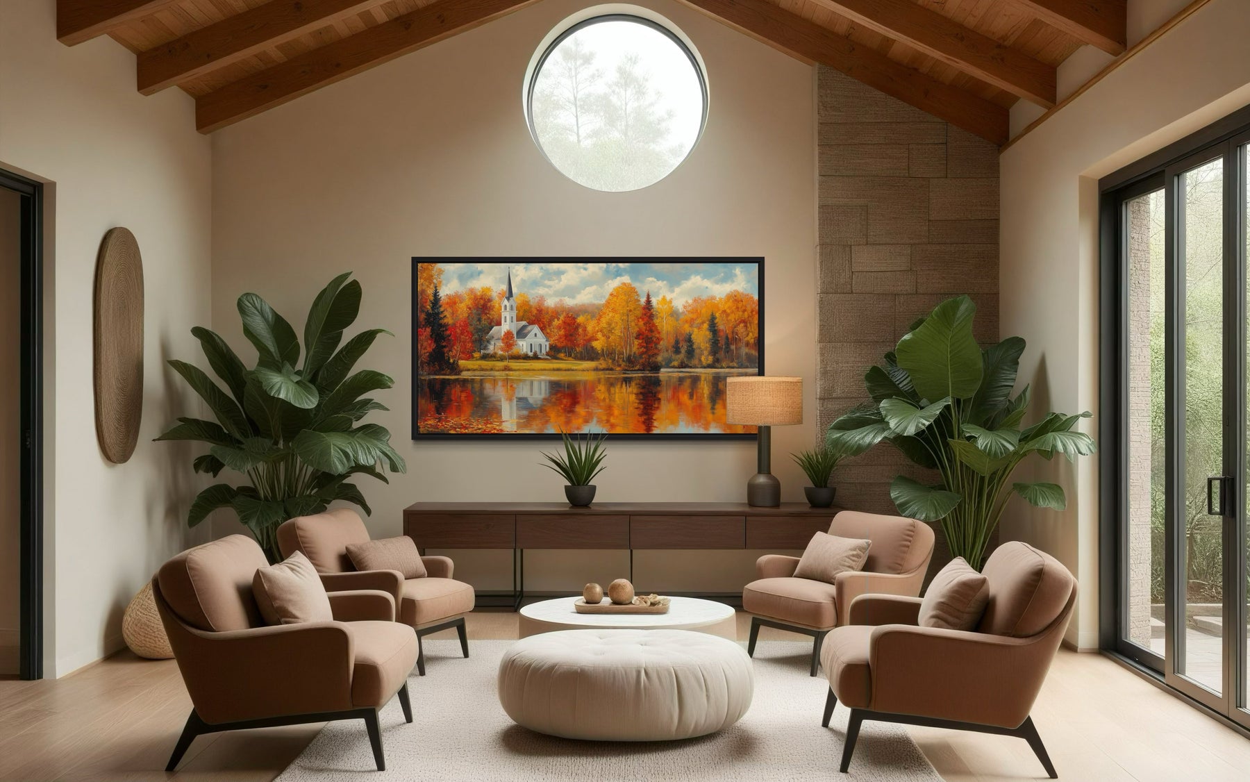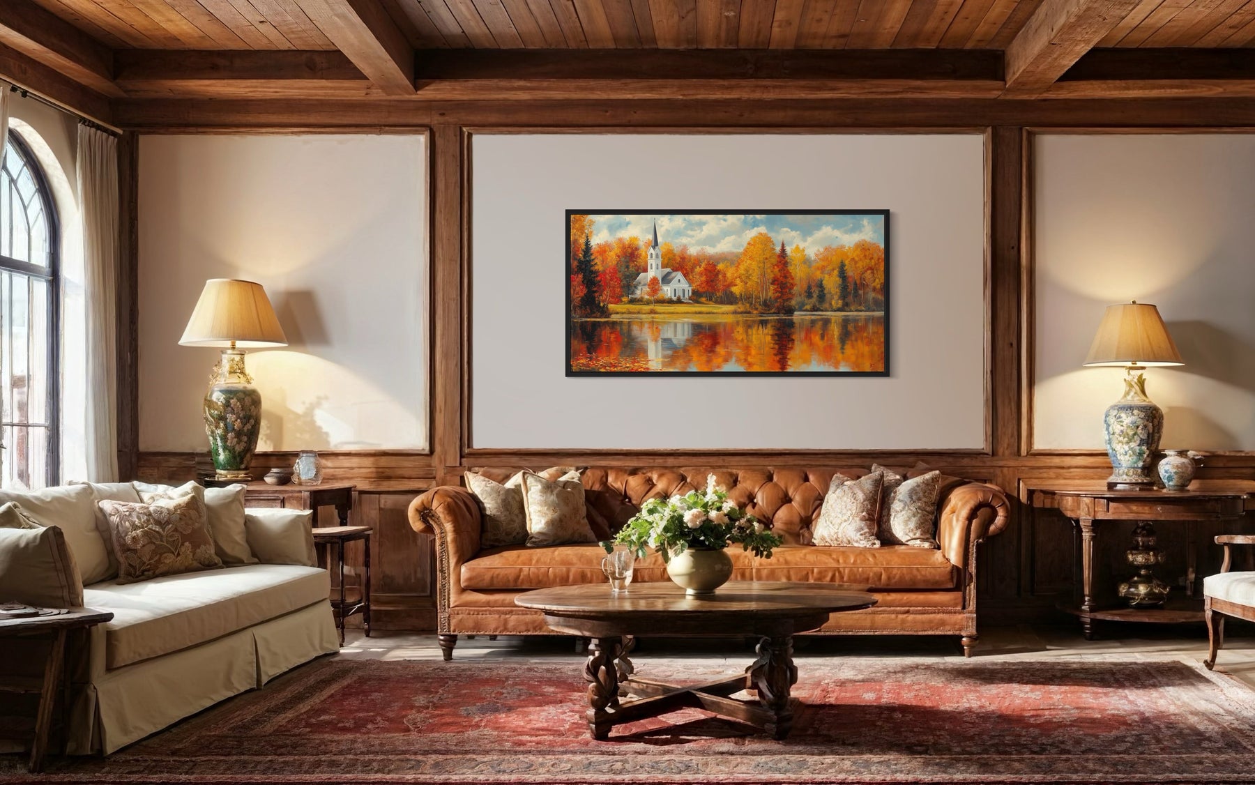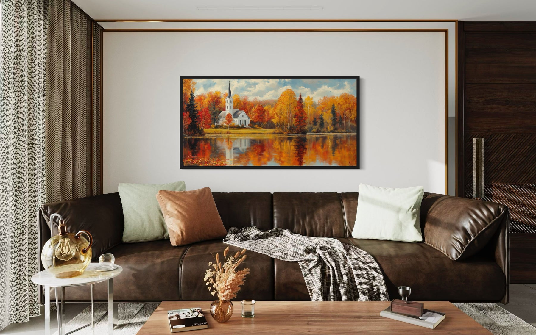 This New England autumn wall art is ideal for homes that embrace a cozy, rustic, or traditional style, making it perfect for living rooms, bedrooms, or even a welcoming entryway. The serene landscape and warm colors are particularly suited for farmhouse-style homes, adding a touch of nature and seasonal beauty to the decor. For those who enjoy seasonal decorating, this painting offers a perfect way to celebrate the fall season year-round. It’s also a great fit for a cabin or lake house, where the natural setting enhances the artwork’s tranquil theme. Even in a more contemporary home, this fall foliage wall decor can add a warm, inviting atmosphere, making it a versatile piece that complements various interior styles. Whether over a mantel, above a sofa, or in a hallway, this New England Vermont church and lake painting will bring a touch of autumnal charm to your space.