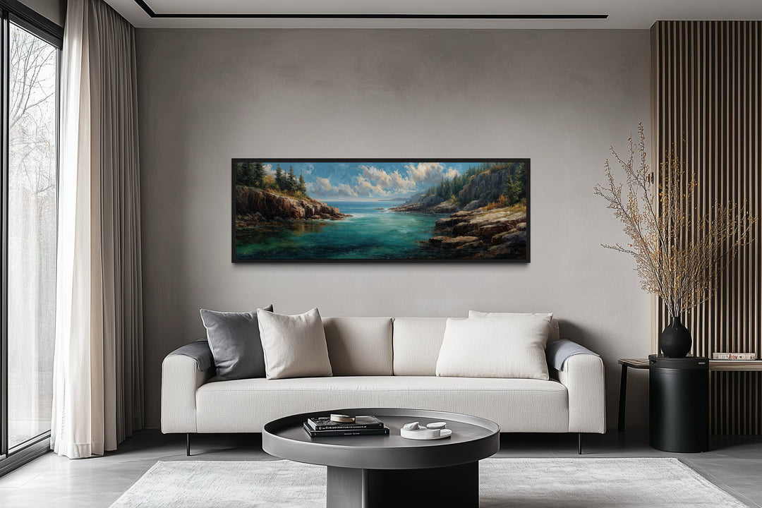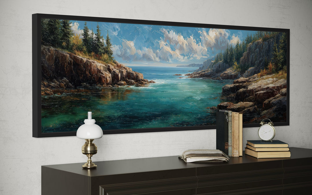 Cette œuvre panoramique Acadia est idéale pour les maisons alliant élégance côtière, charme rustique moderne ou style chalet raffiné où les éléments de design terre et mer se marient naturellement. Son format allongé est parfait pour les grands espaces horizontaux, comme au-dessus d'un canapé de salon, d'une tête de lit ou d'un long mur de salle à manger. Dans les maisons aux textures naturelles comme le bois récupéré, les décorations nautiques, les cheminées en pierre ou les tissus en lin, cette œuvre sublime harmonieusement l'environnement grâce à sa sophistication naturelle. Elle s'intègre également parfaitement aux intérieurs modernes aux lignes épurées et aux palettes minimalistes, offrant une touche de couleur et une beauté naturelle sans pour autant surcharger le design. Pour les chalets de plage, les maisons au bord d'un lac ou les maisons de vacances en pleine nature, cette œuvre symbolise le lieu et rappelle les escapades paisibles en plein air. Elle apporte une atmosphère de calme, de respiration et de clarté aux pièces ouvertes ou aux entrées nécessitant un point de mire visuel. La toile de qualité galerie assure un aspect soigné et fini tout en conservant une image douce et accueillante. Qu'elle soit entourée de murs neutres ou ornée d'accents aux couleurs profondes, cette œuvre offre une profondeur intemporelle et un lien émotionnel avec les côtes sauvages. Cette œuvre panoramique d'Acadia a sa place dans les maisons qui célèbrent la beauté naturelle, l'identité côtière et l'art des paysages paisibles.