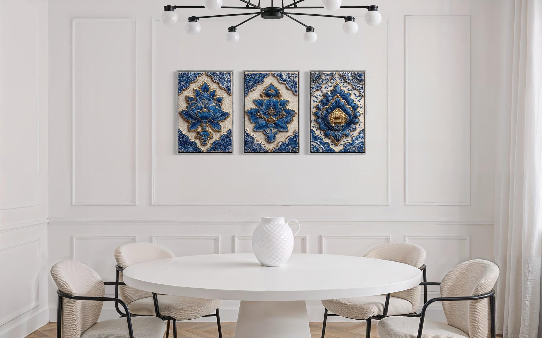 Set of three blue and gold azulejo tile canvas prints displayed on a white paneled dining room wall.