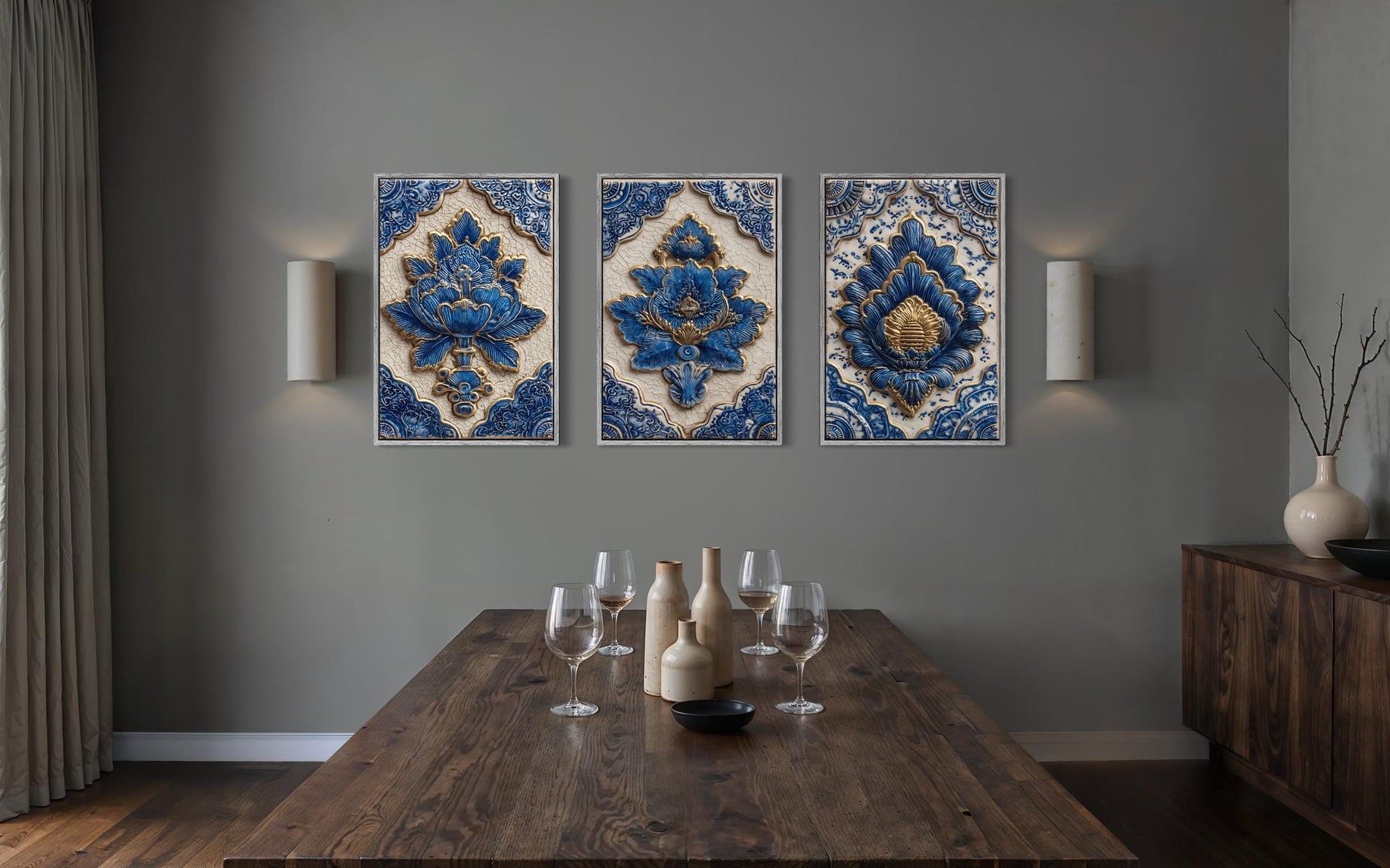 Set of three blue and gold Azulejo tile canvas prints displayed in a formal dining room.