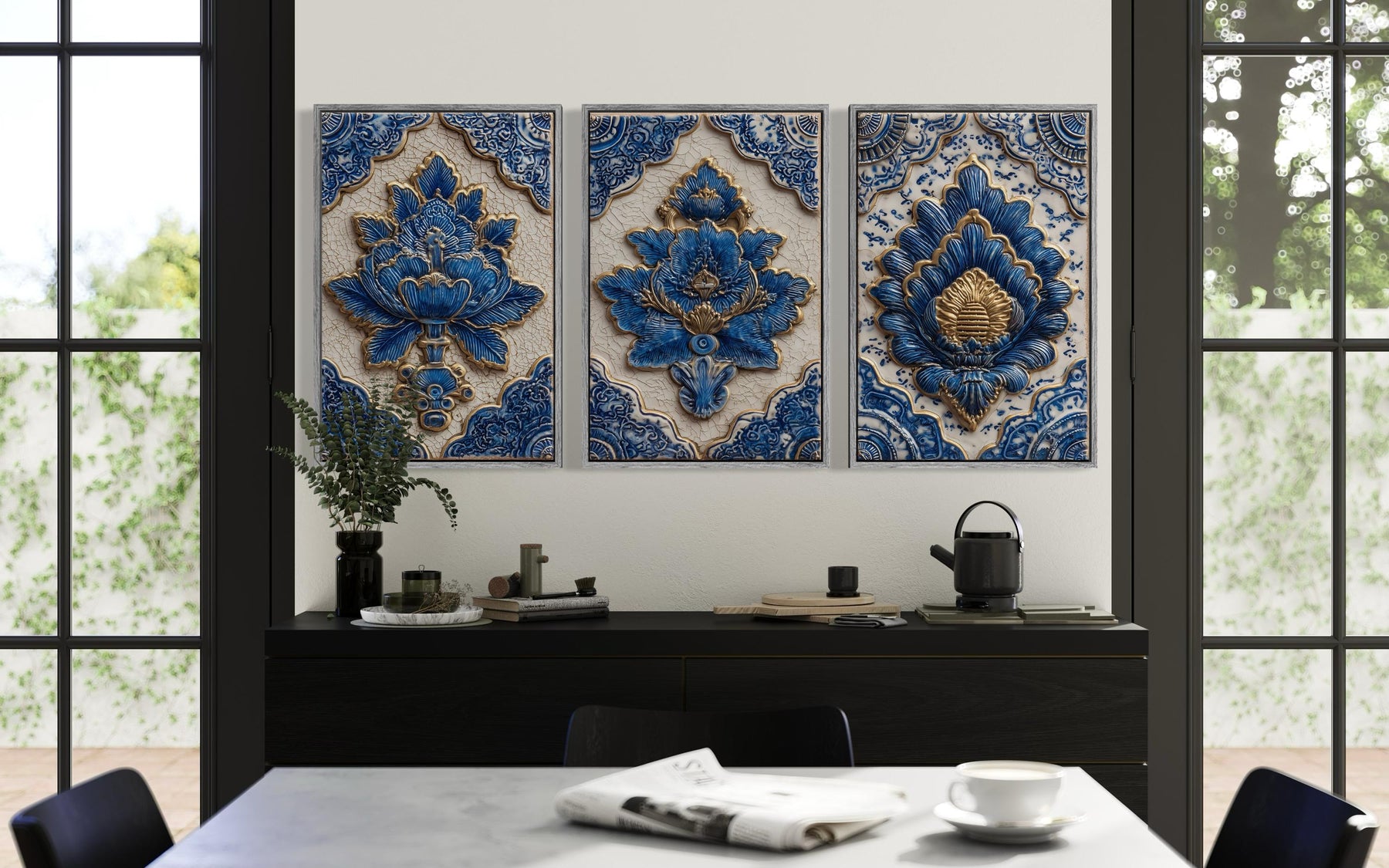 Set of three blue and gold azulejo tile canvas prints displayed above a modern white dining set.