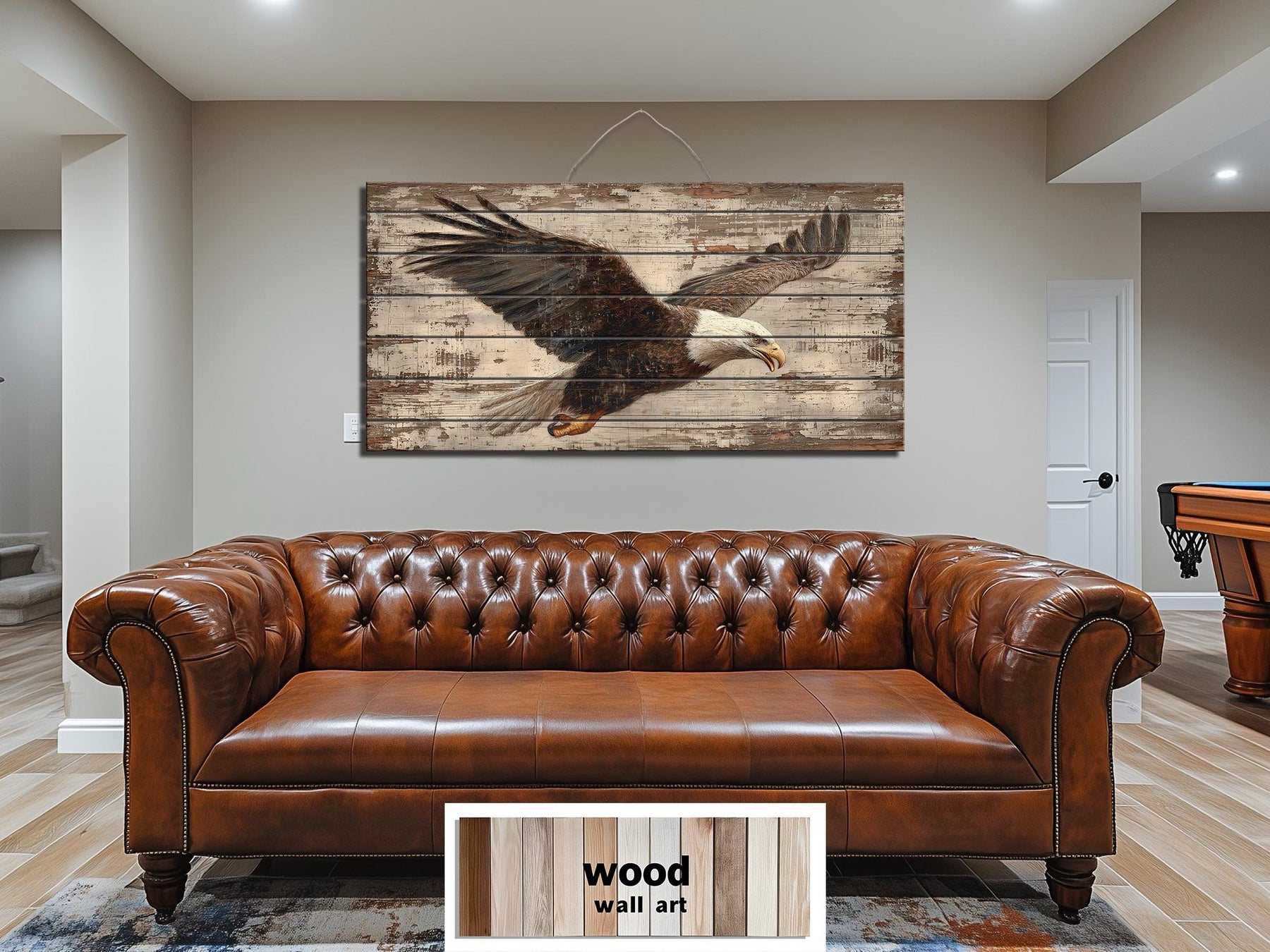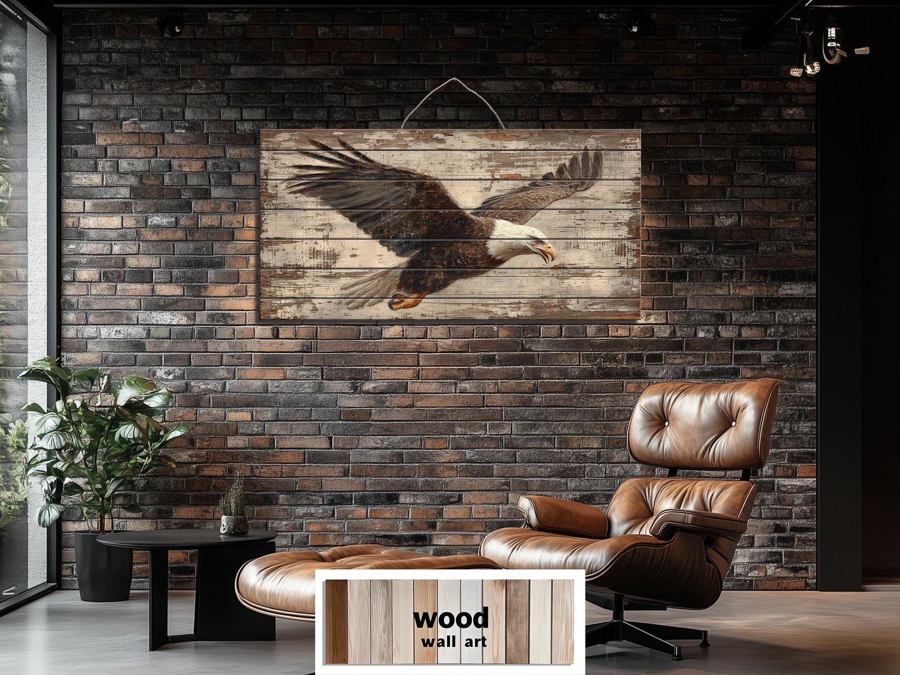 La palette de cette œuvre murale représentant un aigle à tête blanche, réalisée en bois vieilli, se compose de bruns chauds, de crèmes patinées, de touches de gris anthracite et de tons de bois naturel feutrés, créant une ambiance vintage américaine. Le corps de l'aigle est formé de couches de sépia et d'ombre foncé qui donnent de la profondeur aux plumes tout en conservant un aspect rustique harmonieux. Des reflets beige clair et blanc cassé définissent la tête et la queue, assurant la netteté du profil emblématique sur le fond texturé. L'impression vieillie laisse apparaître par endroits le grain naturel du bois, révélant de subtiles nuances miel et chêne qui réchauffent l'ensemble. Des marques grises douces et noires délavées ajoutent du contraste sans dominer la base neutre. Le fond, façon panneau ancien, utilise des variations de tons légèrement usées pour simuler le temps tout en conservant une surface visuellement apaisante. Chaque couleur est légèrement adoucie pour privilégier l'esthétique traditionnelle plutôt qu'une finition brillante moderne. Cet équilibre de teintes chaudes et neutres permet à l'œuvre d'intégrer facilement dans des intérieurs classiques. Les tons naturels font écho aux meubles en cuir, au bois brut et aux éléments en fer que l'on retrouve souvent dans les espaces rustiques. La palette harmonieuse confère à cette œuvre murale en bois vieilli représentant un aigle à tête blanche une présence authentique inspirée des chalets de montagne.